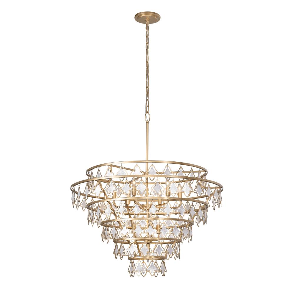 Fleur shines with inspiration from a late 19th century wallcovering housed at Cooper-Hewitt, Smithsonian Design Museum. Fleur incorporates elements reminiscent of the wallcovering's pattern of alternating, stylized, onion-top and spearhead motifs, where each one encloses a similar delicate Fleur-de-lis (Lily Flower) design. Fleur's frame builds upon the spear head motif, modernizing and simplifying the Fleur-de-lis shape as the prominent design element, which also houses a smaller Fleur-de-lis made of sustainable Capiz. Handcrafted from 70% recycled steel. Removeable top stem. Low-VOC French Gold finish.
