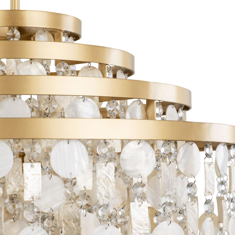 Hand-forged from 70% Recycled Steel. Embellished with Caramel Capiz, Upcycled Kabebe Shell and Lead-Free Crystal. Low-VOC French Gold Finish.