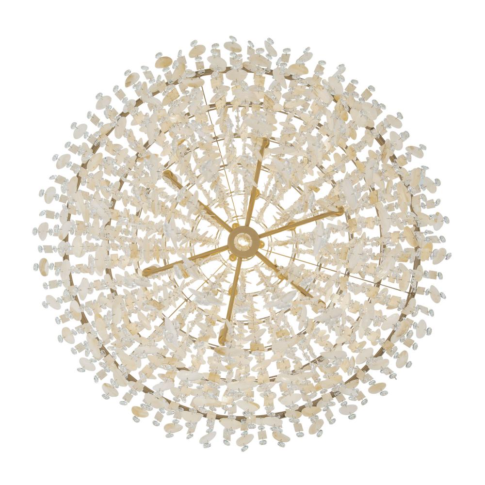 Hand-forged from 70% Recycled Steel. Embellished with Caramel Capiz, Upcycled Kabebe Shell and Lead-Free Crystal. Low-VOC French Gold Finish.