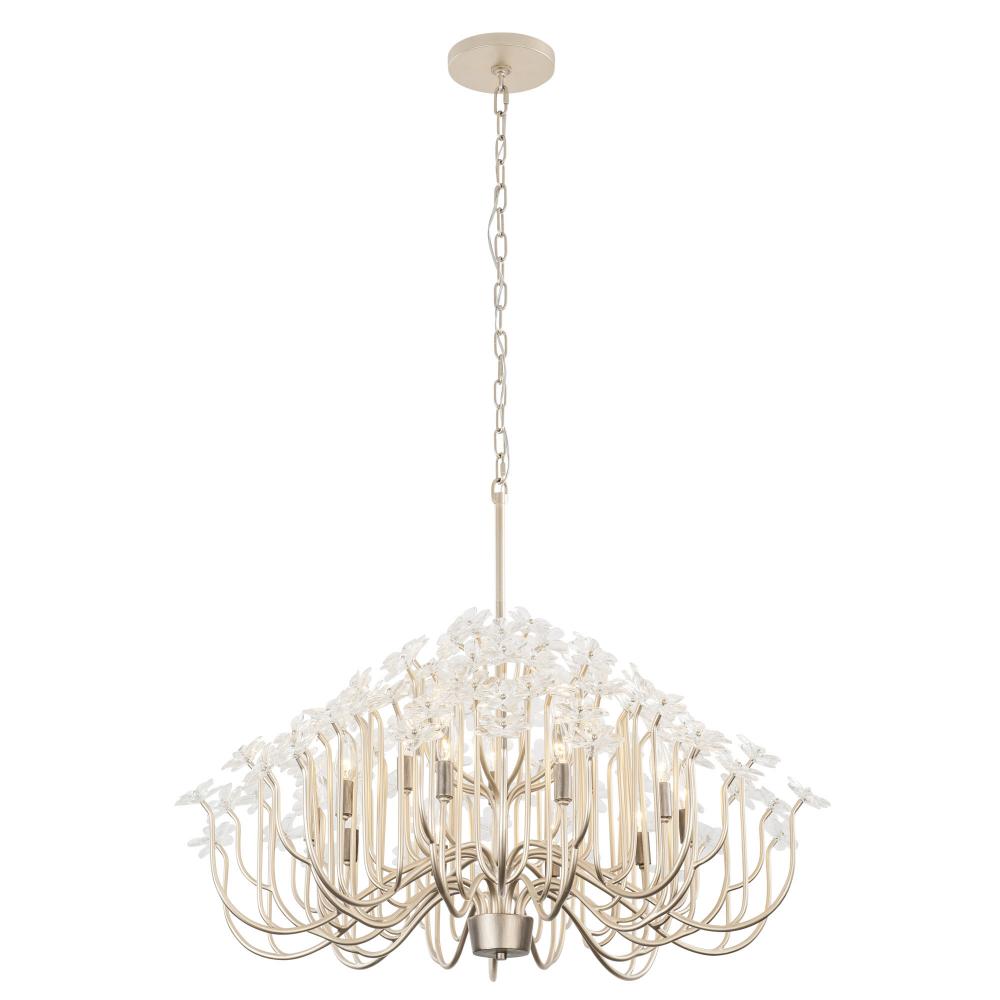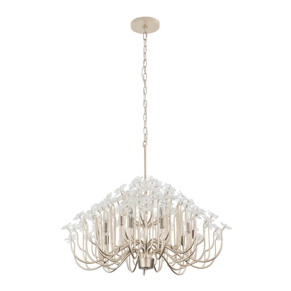 When you first see it aglow with its fine intricacies, it may not show, but the Wildflower collection started its path to existence thanks to Mary V. Walcott's Oconee-Bells discovered in the Smithsonian Libraries and Archives Special Collections. Taking center stage is a touch of Danish modern on top of midcentury. Wildflower combines delicate, handmade ice glass flower petals, with equally delicate wispy hand-forged and recycled steel tubing and metal work. Available in gold or black.