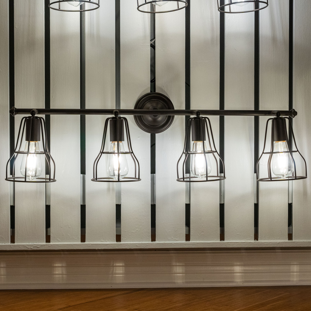 Cage like features give the Clybourn bath collection a modern yet industrial flair. Urban loft inspired spaces are a sure fit for this collection, handsomely finished in oil rubbed bronze. The simple bell-shaped characteristics are stylishly offered in both ceiling and wall mounted styles, perfect for a bath, hallway or even home office. The adjustable shades allow flexibility so light is pointed where needed most. Combine that with a vintage Edison style filament bulb to complete the look.