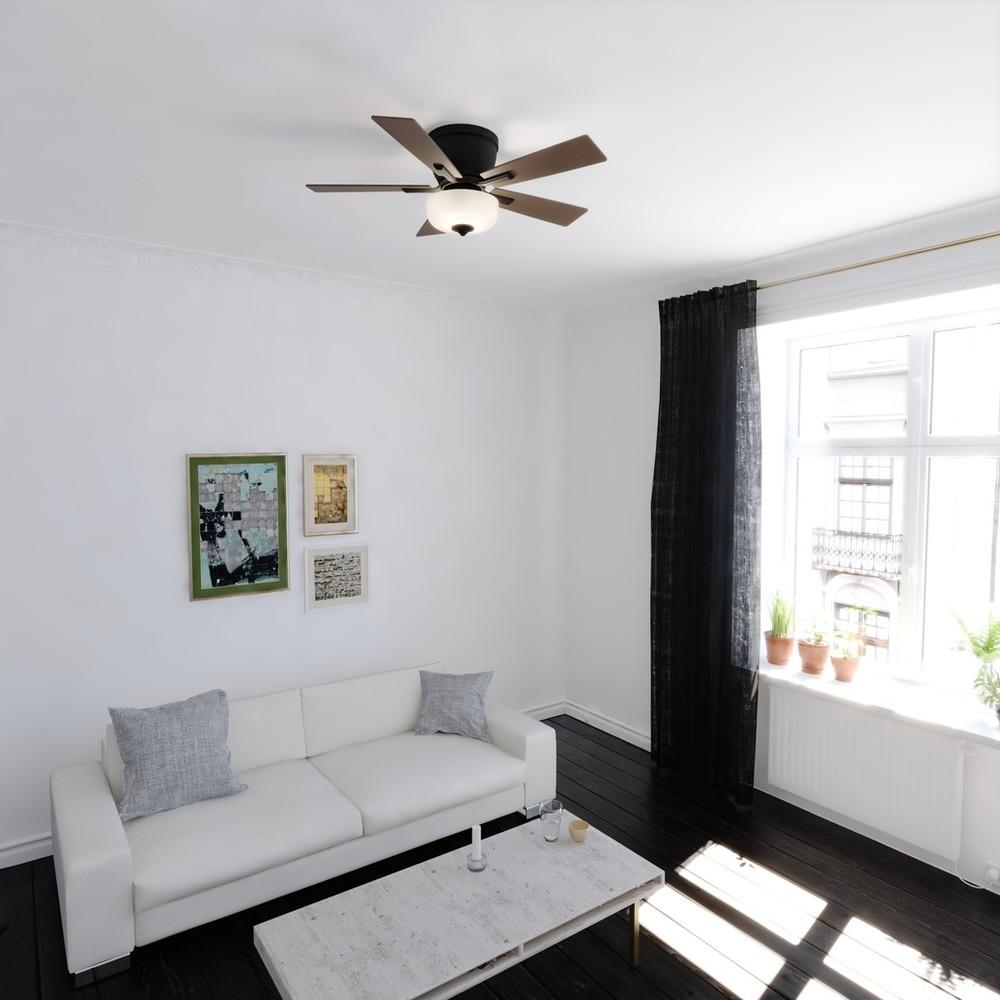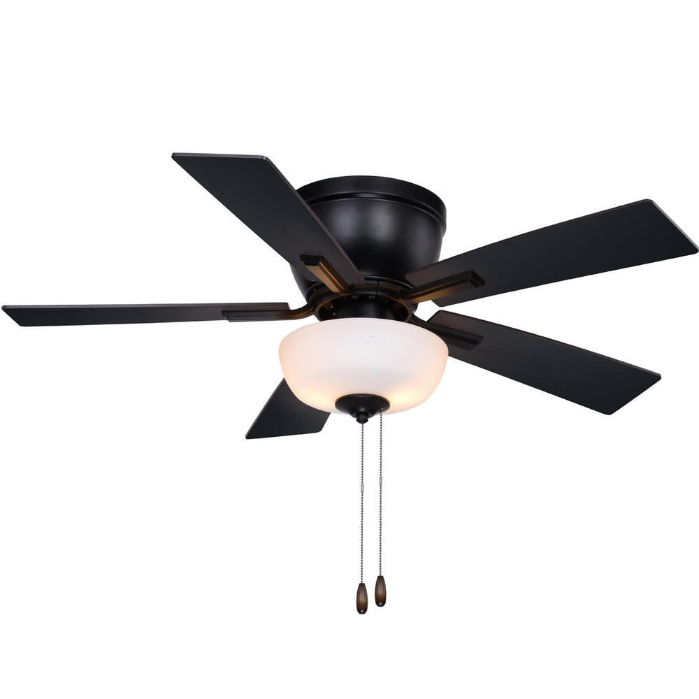 The Lisbon brings life to any on trend interior space. This flush mount ceiling fan is ideal for low ceilings and includes the bowl shaped glass light kit. Switch up your look with the five reversible blades of brown hickory or black hickory colors. Two pull chains operate the light and fan independently. This simple design and black finish make a statement in sleek elegance. Suitable for bedrooms, family rooms and other living spaces.