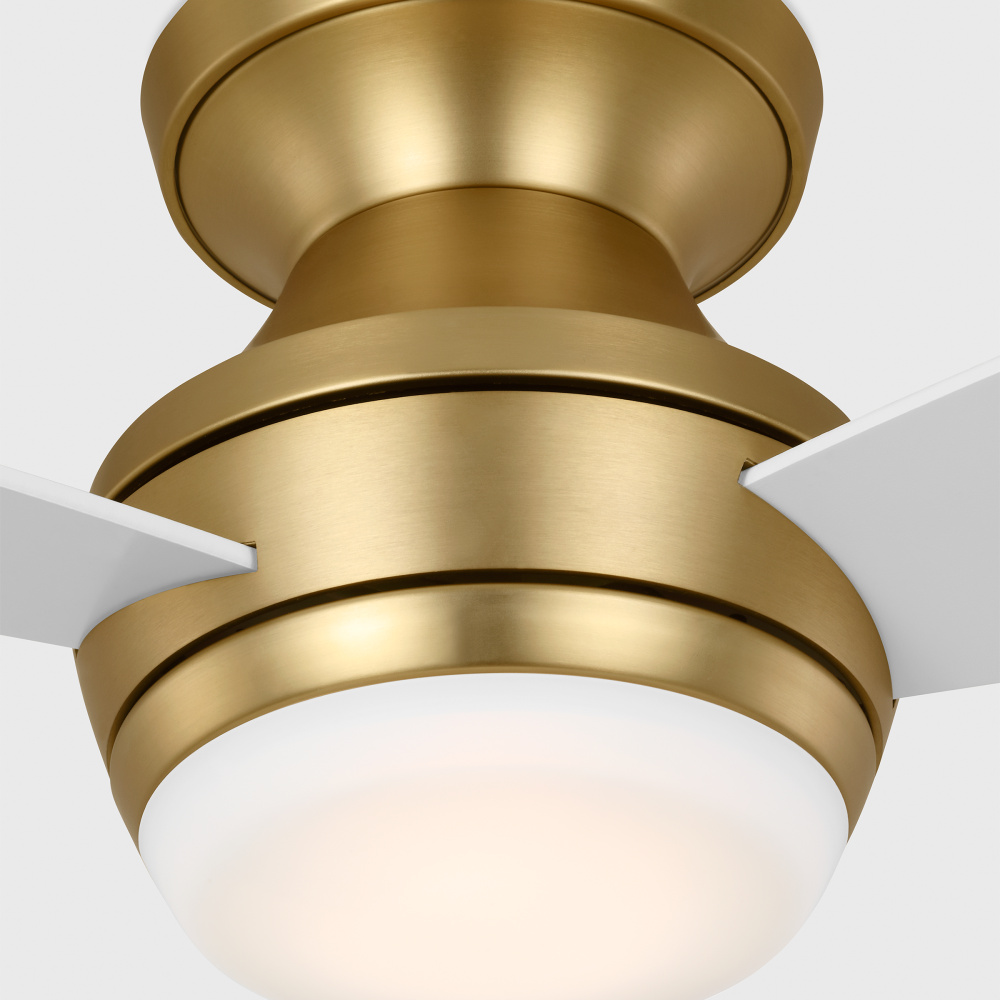 Ikon 44 Hugger LED Ceiling Fan in Burnished Brass with Matte White Blades and Light Kit