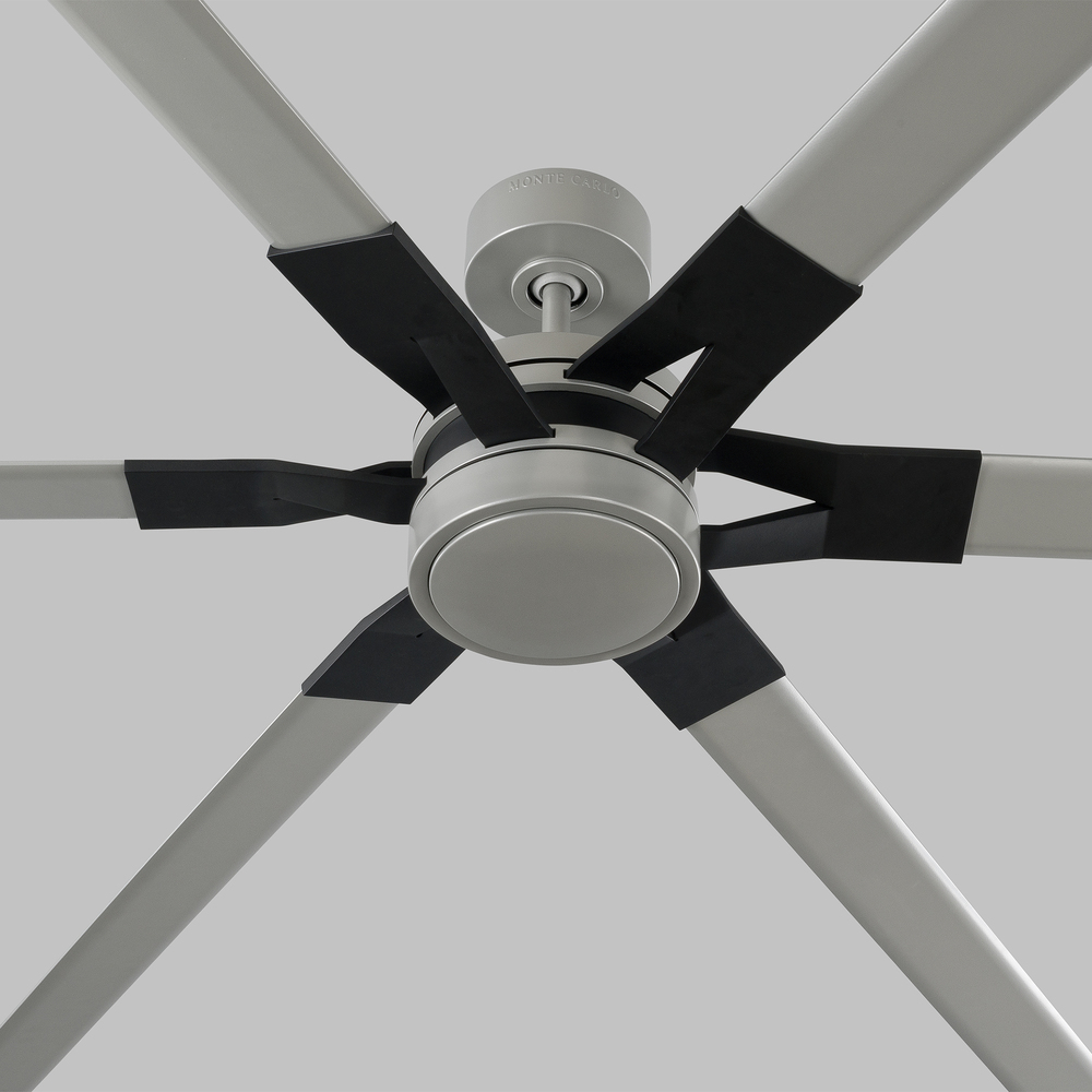 The Sean Lavin Loft 96 LED - Brushed Steel w Midnight Black in painted brushed steel features a 125.0 X 25.0 6 speed motor with a Thirteen degree blade pitch. With a unique split blade iron design, two-tone finish combinations and extruded aluminum blades, Loft is ideal for modern homes and commercial environments. The large-scale 96” fan has a powerful DC motor that uses minimal electricity and a bright white energy-saving LED downlight. Circulate air and create a strong base of ambient light in your projects with Loft by Sean Lavin.