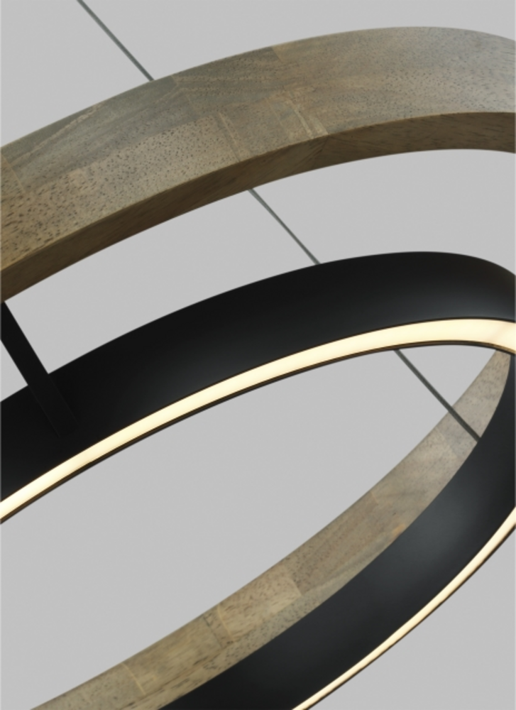 Grace 24 Chandelier by Sean Lavin is designed with two rings that illuminate this contemporary chandelier. A large natural oak outer ring has organic texture complemented by a decorative black inner ring housing gently diffused upward and downward LEDs. Featuring integrated LED technology on the inner ring, the Grace Chandelier provides a graceful halo of light. Lamping options are compatible with most dimmers. Refer to the Dimming Chart for more information