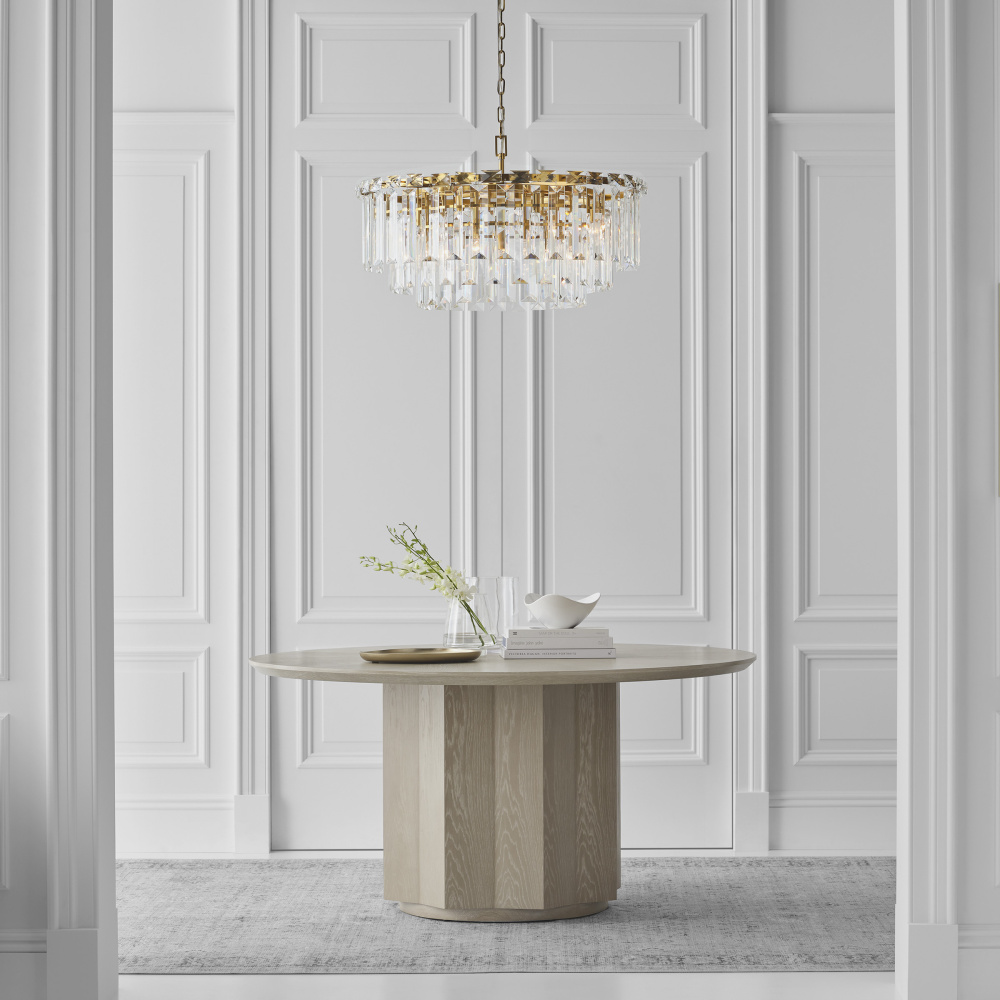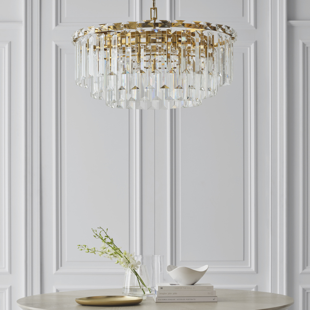 Inspired by the Art Deco style of 1920s Paris, the Arden series from C&M by Chapman and Myers captures the period's fascination with geometric forms. A stunning addition to an entryway, great room, or above a large dining table, the Arden tiered chandelier features panels of textured glass that hang in linear architectural tiers from a solid metal frame.