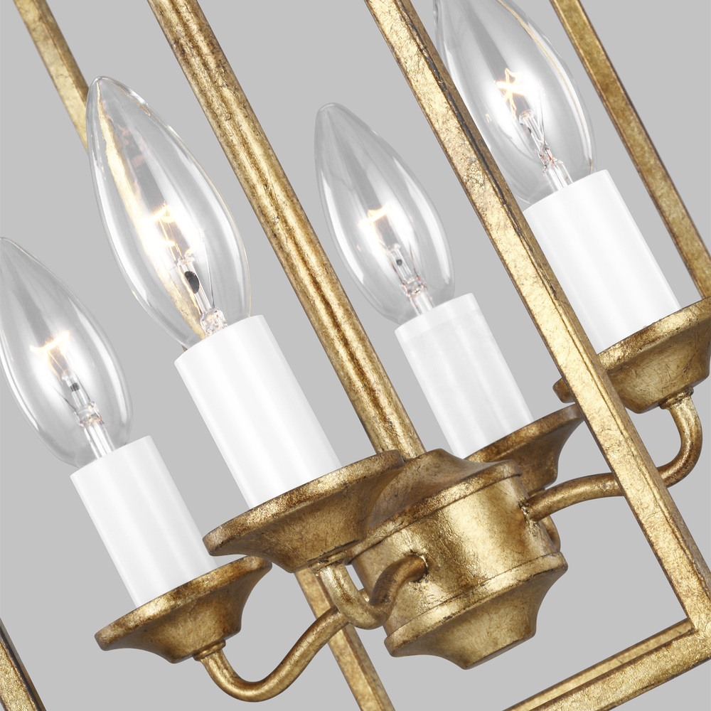 The Bantry House lanterns from Alexa Hampton sport an open, airy frame with an elegant, birdcage-like design. Slim, straight metal bars swoop down from the canopy to align around the leading drum-shaped edge. The central column suspends an inner candelabra structure with four curved light arms, simple candle cups, and a globe canopy. Bantry House's four indoor light pendants in antique gild provides abundant light to your home while adding style and interest.