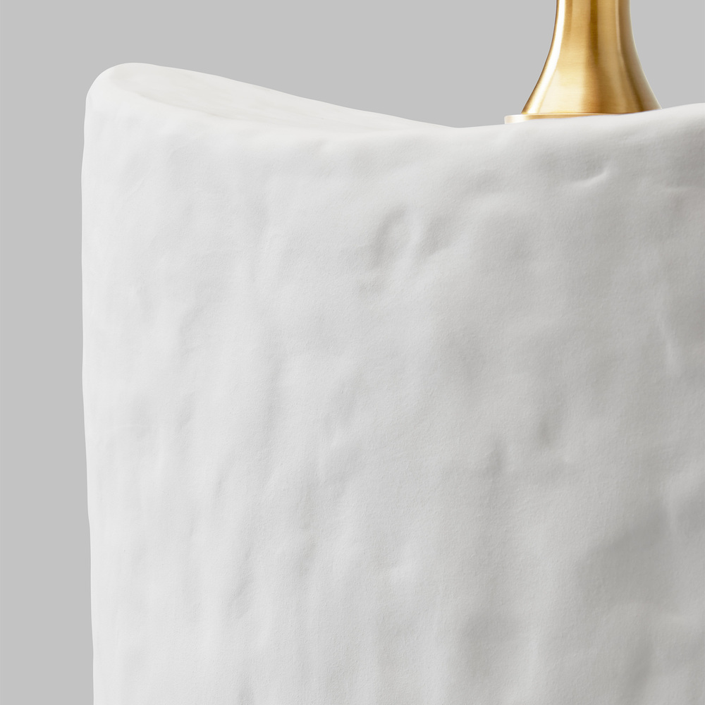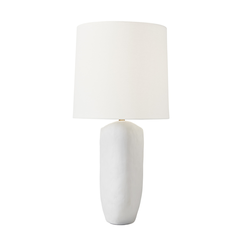 The Cenotes one light table lamp in matte white by Hable is hand built that displays organic indentations. Cenotes embodies shapely, textural abstract forms and complementing shades of fine fabric. Sweeping shoulder and curved body gives a nice canvas to see the all of unique one of a kind indentations. CENOTES provides abundant light to your home, while adding unique style and interest.