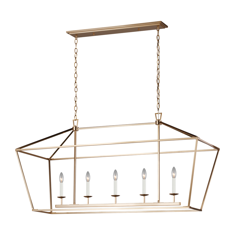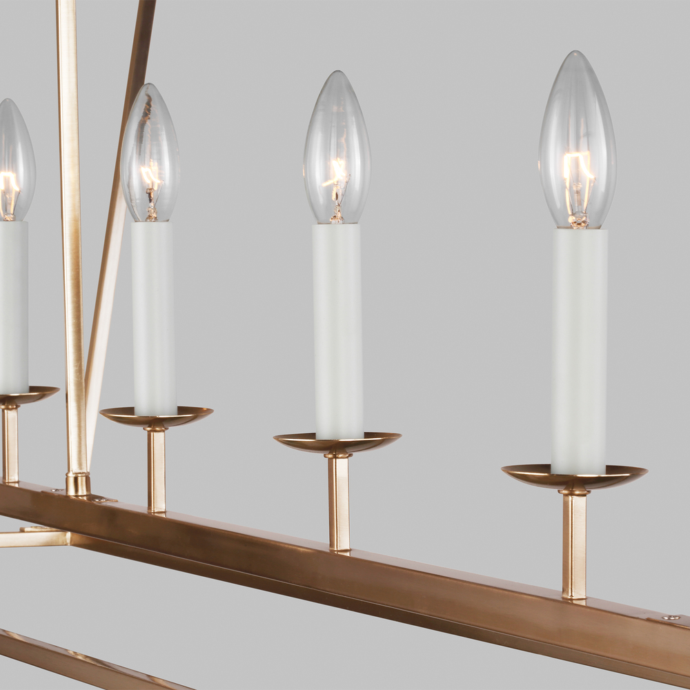 The Dianna five light Linear Chandelier by Visual Comfort Studio is offered in the Midnight Black, Satin Brass or Brushed Nickel finish. The dark and transitional open frame encompass generously proportioned candelabra style bulbs. This updated silhouette brings a modern element to your cozy ambient lighting design.