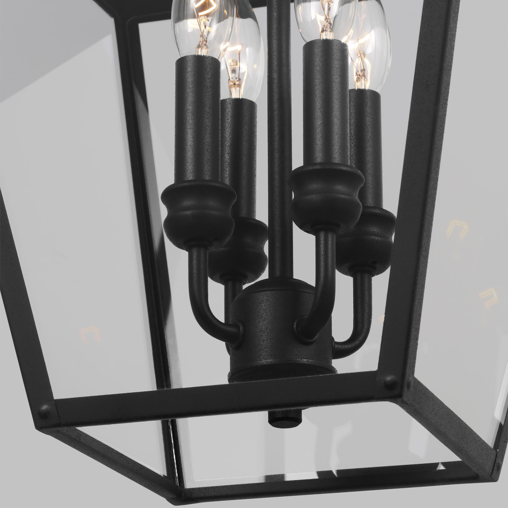 Designed by Sean Lavin, the Galena four-light outdoor pendant fixture in textured black enhances the beauty of your property makes your home safer and more secure and increases the number of pleasurable hours you spend outdoors. Galena is a Europe-inspired classic lantern. Simple and refined, Galena features a gently curved hook detail atop a vented, square-off roofline and candle tubes floating within the tapered clear glass shades. Galena is a warm, welcoming silhouette offered in a Sable or Textured Black finish.