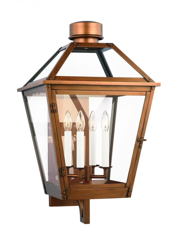 The Hyannis four light outdoor wall fixture in natural copper by Chapman & Myers has a classic copper lantern profile with top and bottom glass panels. Assembled with an overlapping metal frame which is accented by rivet details. Each light has a historically inspired spun metal chimney cap. The sconces are supported by a traditional bent metal architectural bracket.