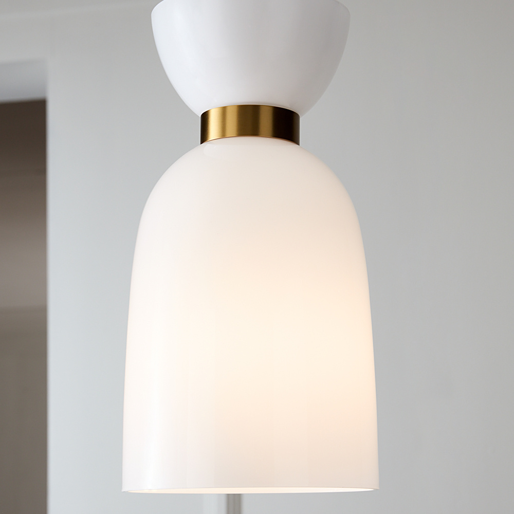 Londyn is inspired by geometric playful midcentury fixtures in metal and glass with exciting profiles and scale play. Two glass spheres with a simple metal cuff and a single bulb—an elegant pendant with graphic interest. This pendant would be great as a single or in multiples over a kitchen island.