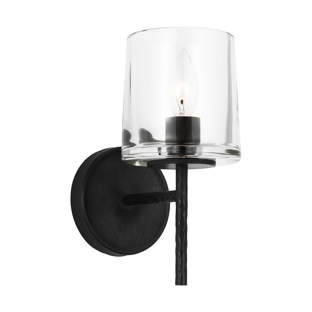 The Marietta one light wall sconce in Aged Iron embodies Industrial charm with Midcentury flair, the Marietta vanity series features curved arms and mouth blown glass. This streamlined vanity series is crafted in an Aged Iron hammered iron finish that is simple yet timeless. Sophisticated and modern with an industrial edge, this sconce boasts a classic look that works well in any decor.