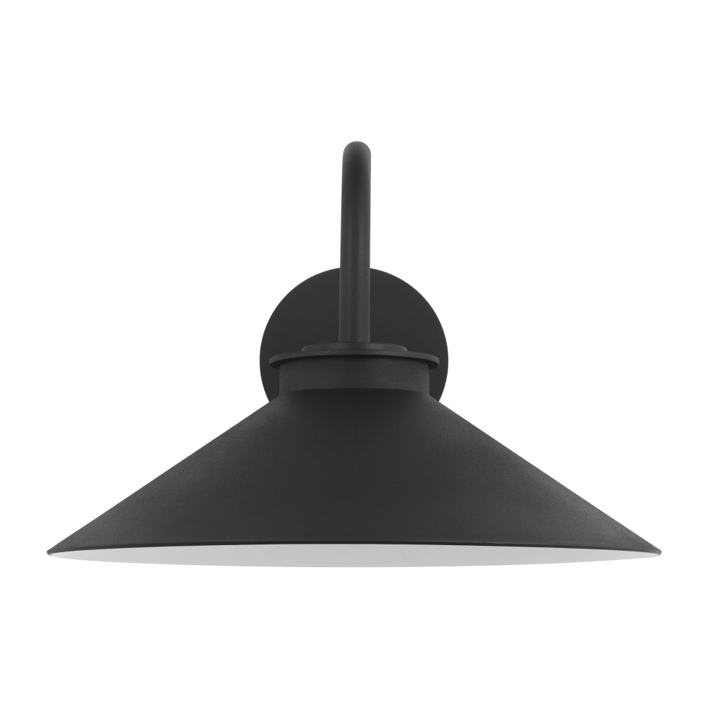 The Modern Barn Lights by Sean Lavin has a minimal silhouette and a textured Black finish, bringing a modern and industrial style to your main entrance. It's made from metal, and it hangs from a round back plate and a sleek, curved arm. The shade has a bell-shaped design that reminds us of classic barn lamps This elegant light is a beautiful and functional wall lantern with industrial accents, complementing porches, patios, and other outdoor areas.