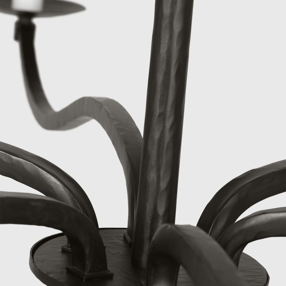 Channels traditional craftsmanship with a modern interpretation, featuring square iron tubes forged into gracefully curved arms