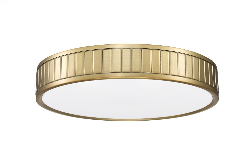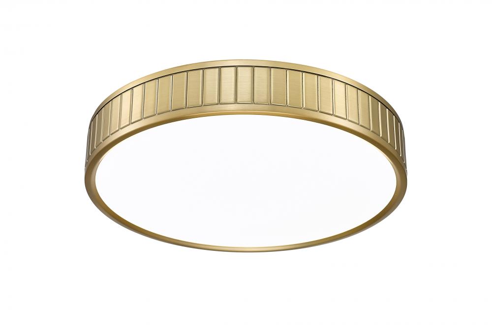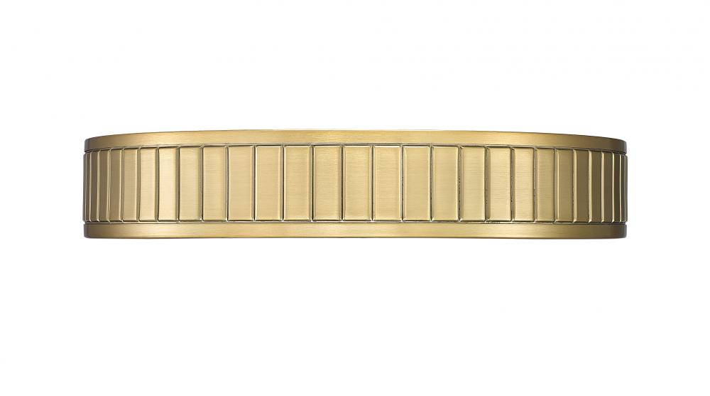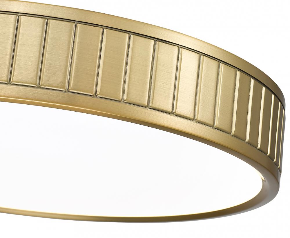 A glam modern gold finish is warm and inviting as it complements updated living spaces with a low-key aesthetic. Steel construction forms a ring canopy with vertical slats nestling a frosted acrylic diffuser that sends optional and changeable white-color values to light up a modern kitchen, dining room, or foyer.