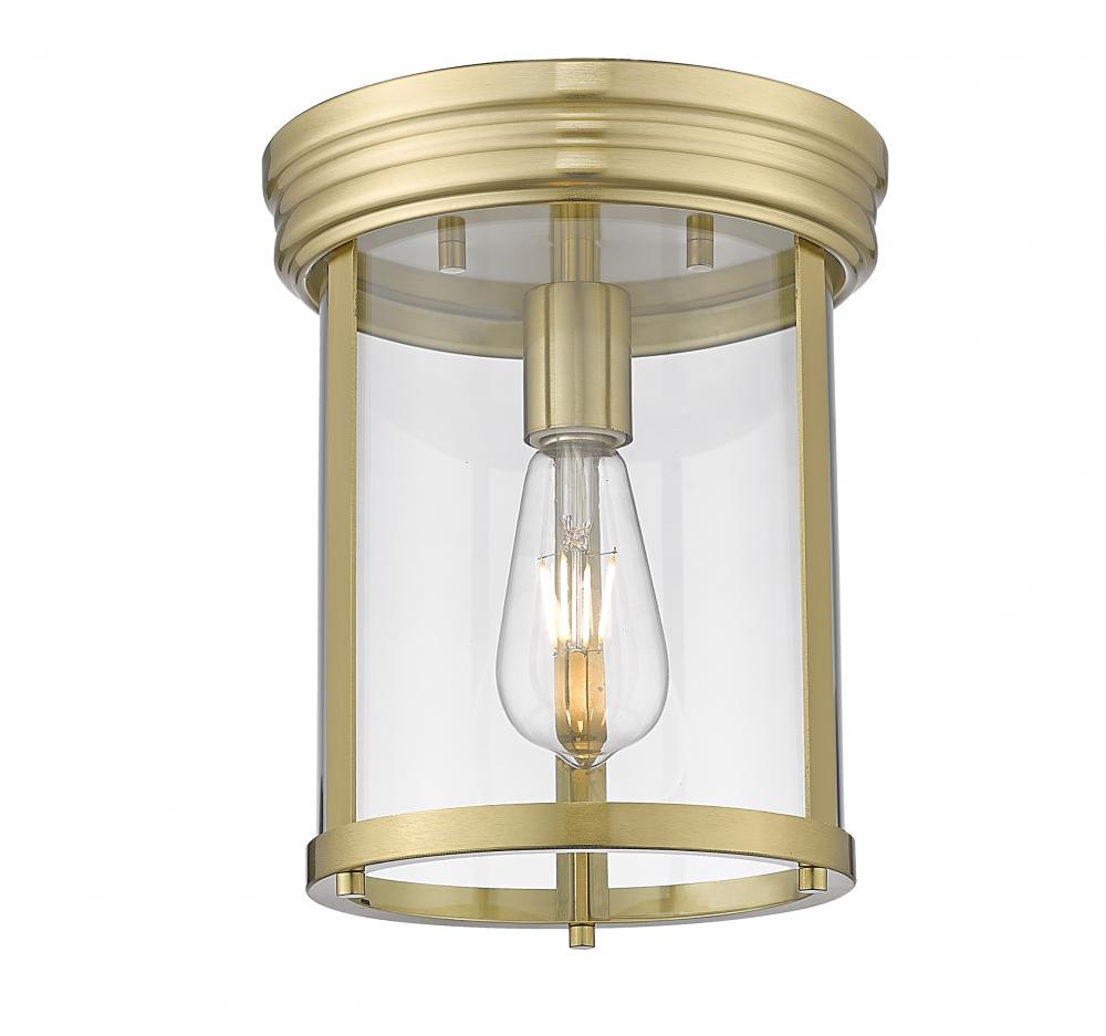 Embrace sleek style with the minimalist silhouette of a modern one-light flush mount ceiling light. From the Thayer collection, it pairs a cylinder of clear glass with a rich, warm luxe gold and installs at the ceiling for maximum versatility in bedrooms, halls and other living areas.