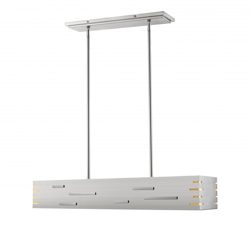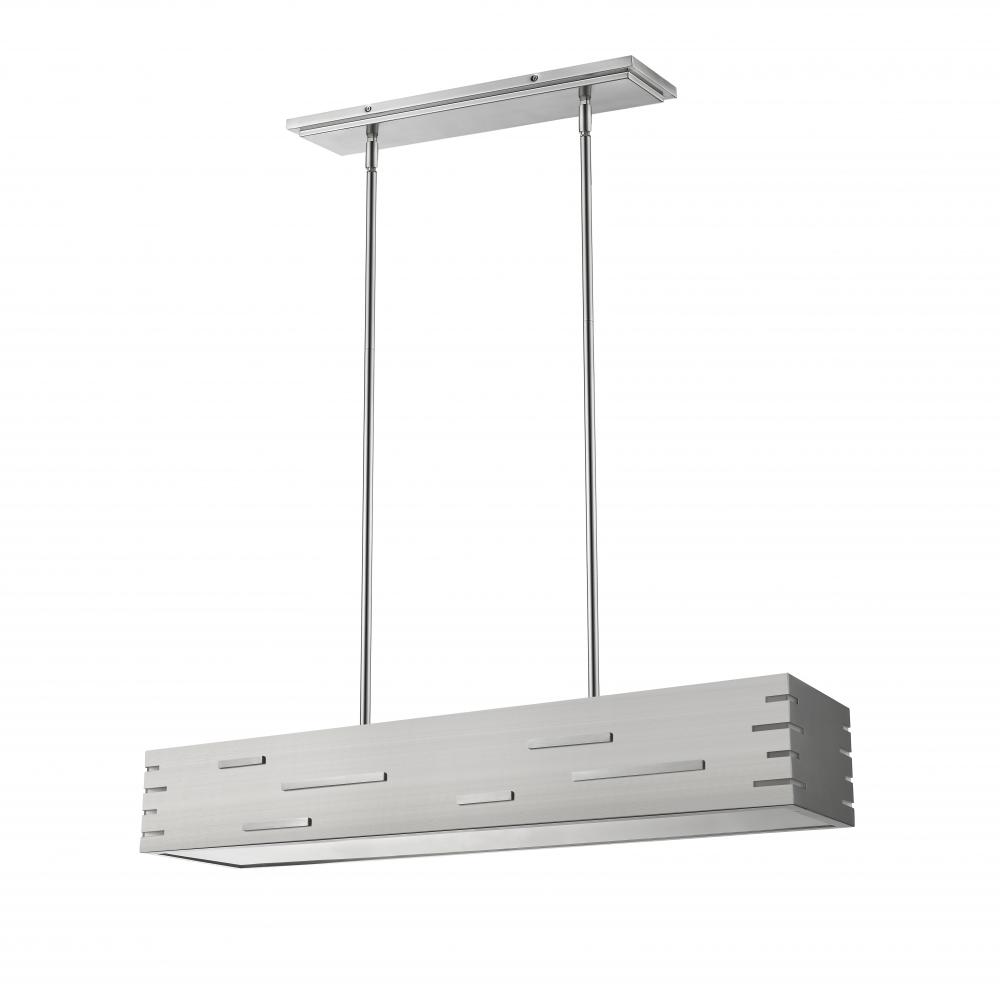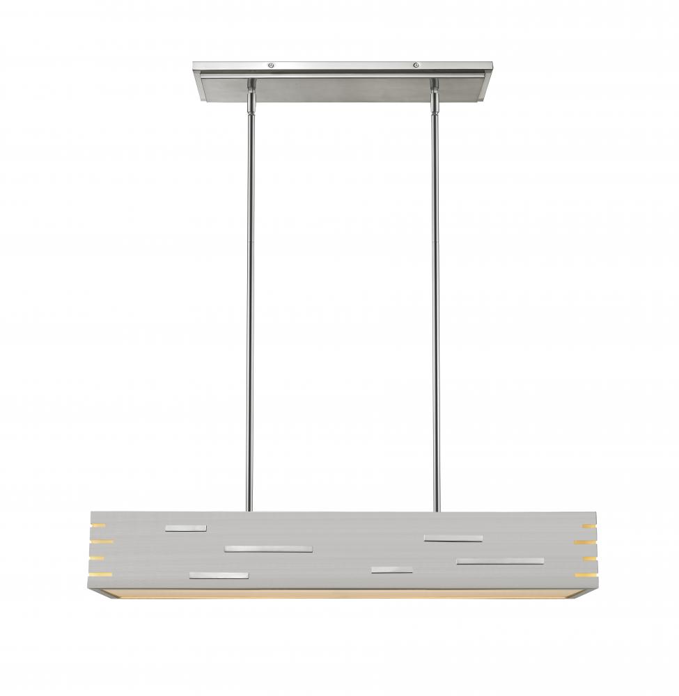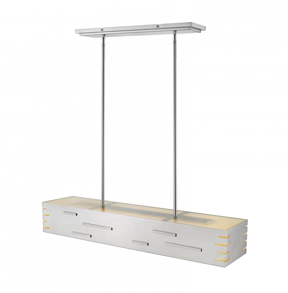 Modern and energetic with a hint of artistic style, this brushed nickel steel one-light chandelier is a perfect complement to a compact bar or island space. Its symmetrical geometric silhouette creates a visually captivating form, and updated integrated LED technology allows for energy-saving efficiency.