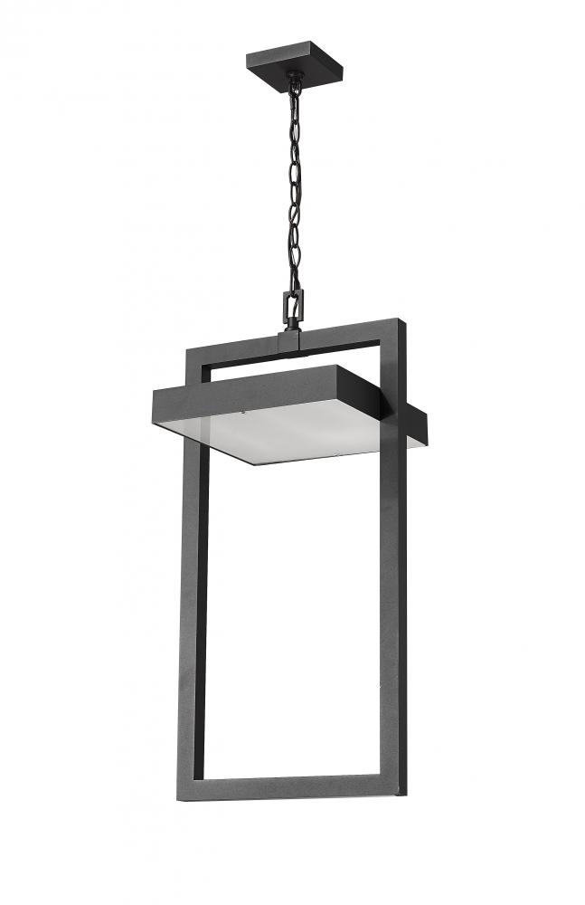 A cutting-edge solution for illuminating your contemporary patio, deck or garden area, this one-light outdoor chain mount ceiling fixture delivers chic minimalism with its angular bold black finish aluminum frame. A sand blast finish white glass shade uses LED-integrated technology to provide a strong, energy-efficient glow to light up evenings outdoors.