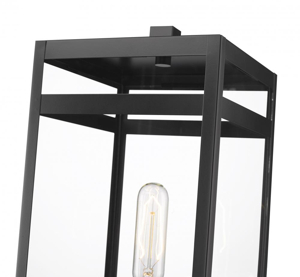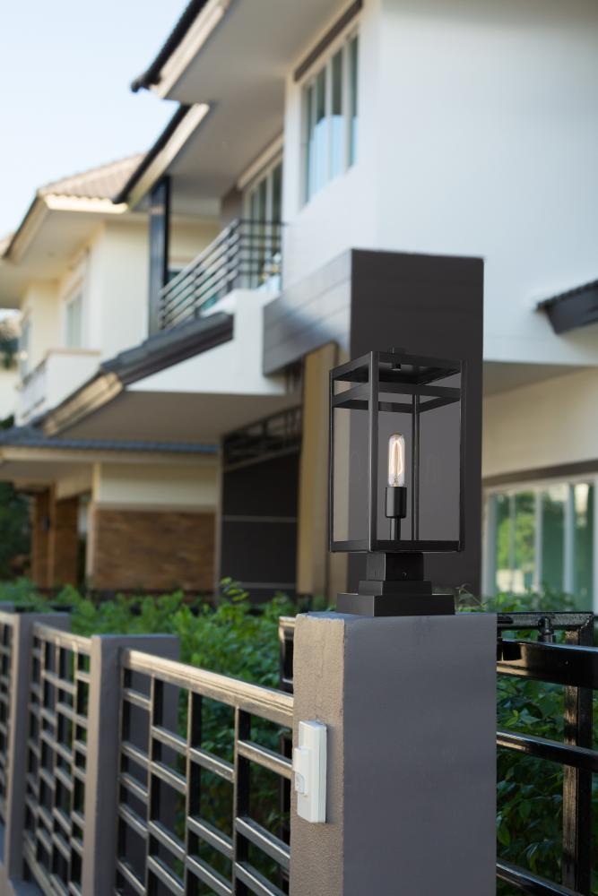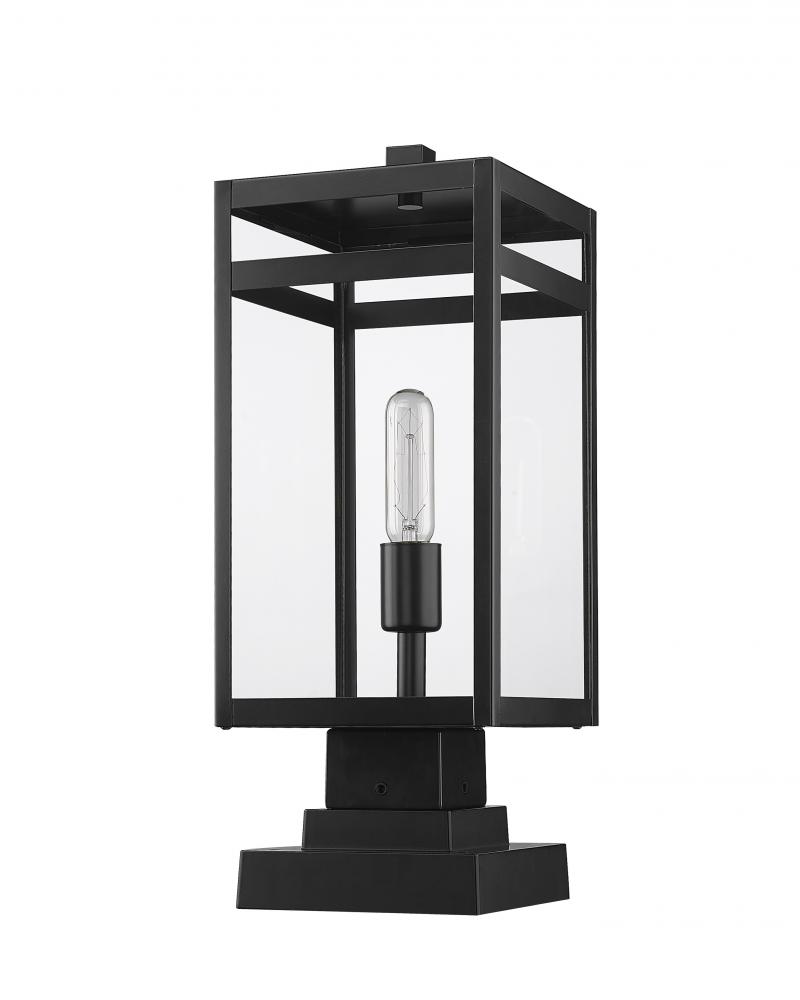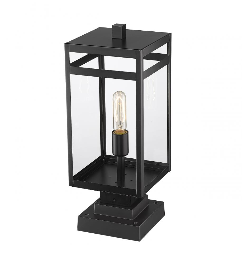 Include an industrial light source on your patio or porch with this one-light outdoor pier mounted fixture made from steel with a stacked base design. It features a versatile black finish and a crisp, clear glass shade which displays a bulb within.