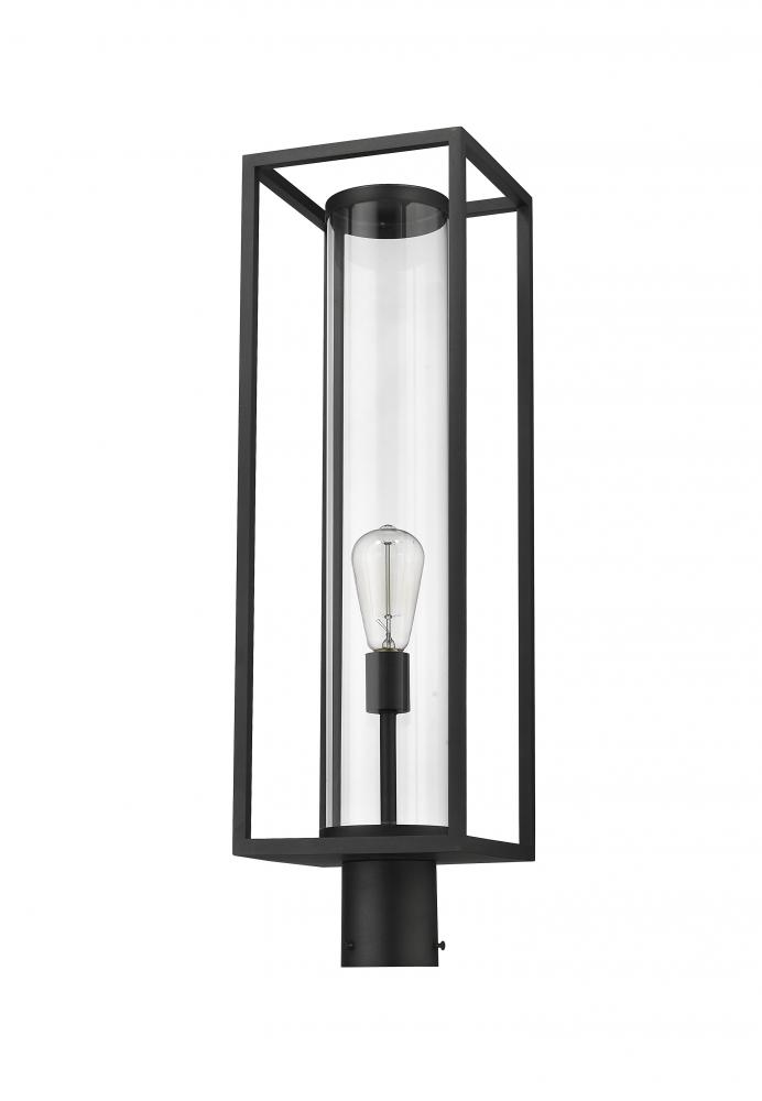 Illuminate spacious decks and patio verandas with this modern outdoor post mounted fixture from the Dunbroch collection. Featuring an open, airy rectangular lantern, this outdoor patio fixture can be mounted on railings or landscape posts to cast a soothing glow. This outdoor light fixture also features a striking, dark black aluminum frame, along with a single light set inside a clear glass cylindrical globe, lending a classic, yet contemporary style to any landscape.