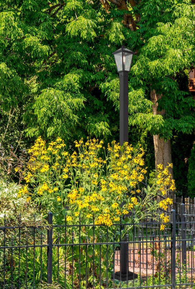 Softly illuminate an exterior front or back walkway with a classic fixture reflecting a charming village theme. Made from Midnight Black metal and clear beveled glass panels, this one-light outdoor post mounted fixture delivers a charming upgrade with an industrial attitude and a sleek geometric, linear post.