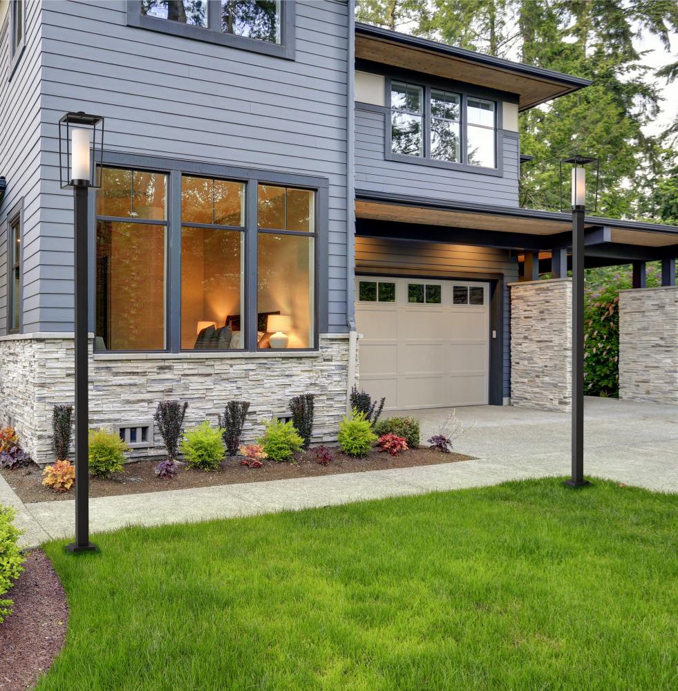 A black finish steel frame and post create dynamic elegance perfect for illuminating homes and walkways, making the Sheridan one-light outdoor post mounted fixture an excellent option. With a minimalist design and an open box-style frame made of black finish steel, this stylish light glows through a filtered shade made of white opal glass.