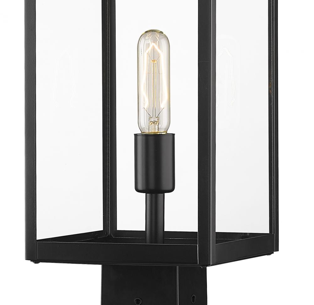 Embrace a slightly minimalist feel with intersecting linear elements in a fixture designed to update exterior spaces. The Nuri one-light outdoor post mounted fixture blends a box-style frame and post made of black finish steel with clear glass panels and a slender bulb base, adding an endearing transitional look to a residential or commercial property.