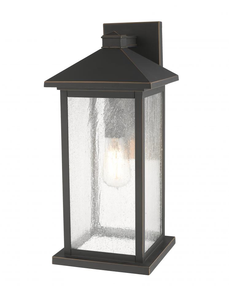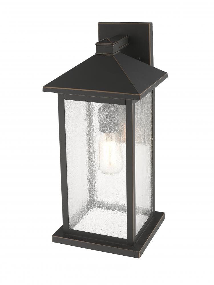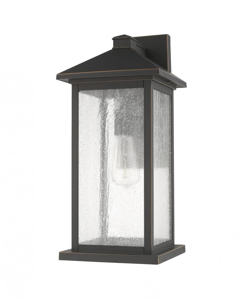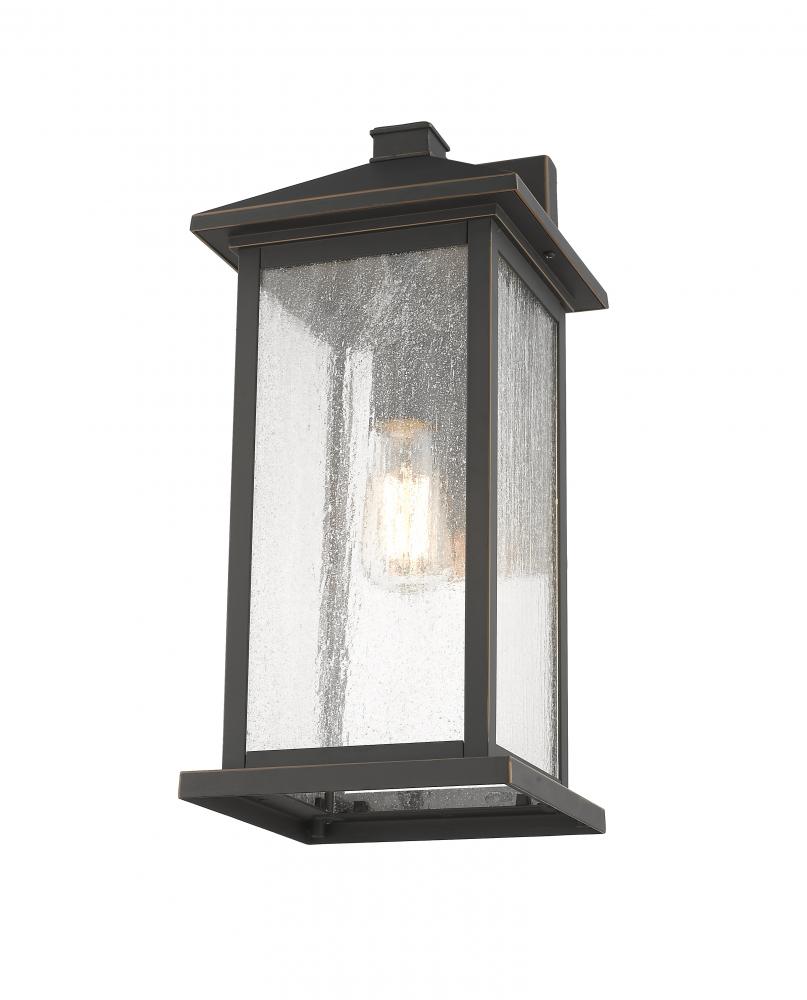 Elongated lines and sophisticated design marry in this one-light wall lantern. Radiate warmth from the outdoor rubbed bronze finish and multidimensional clear seeded glass shade.