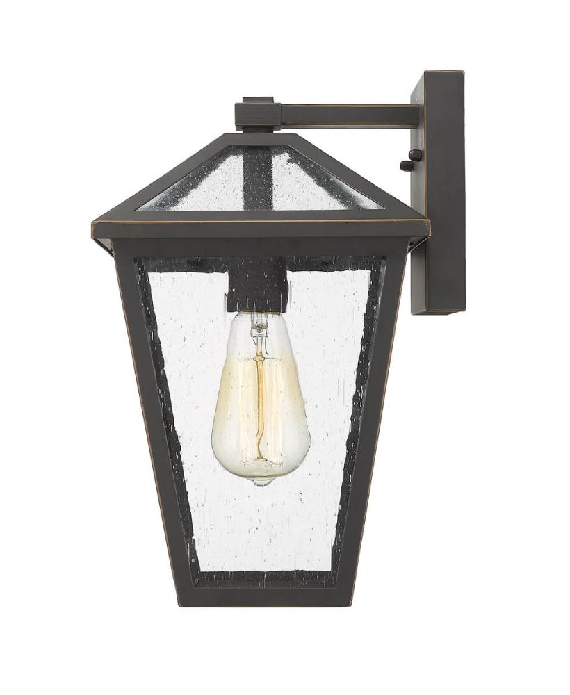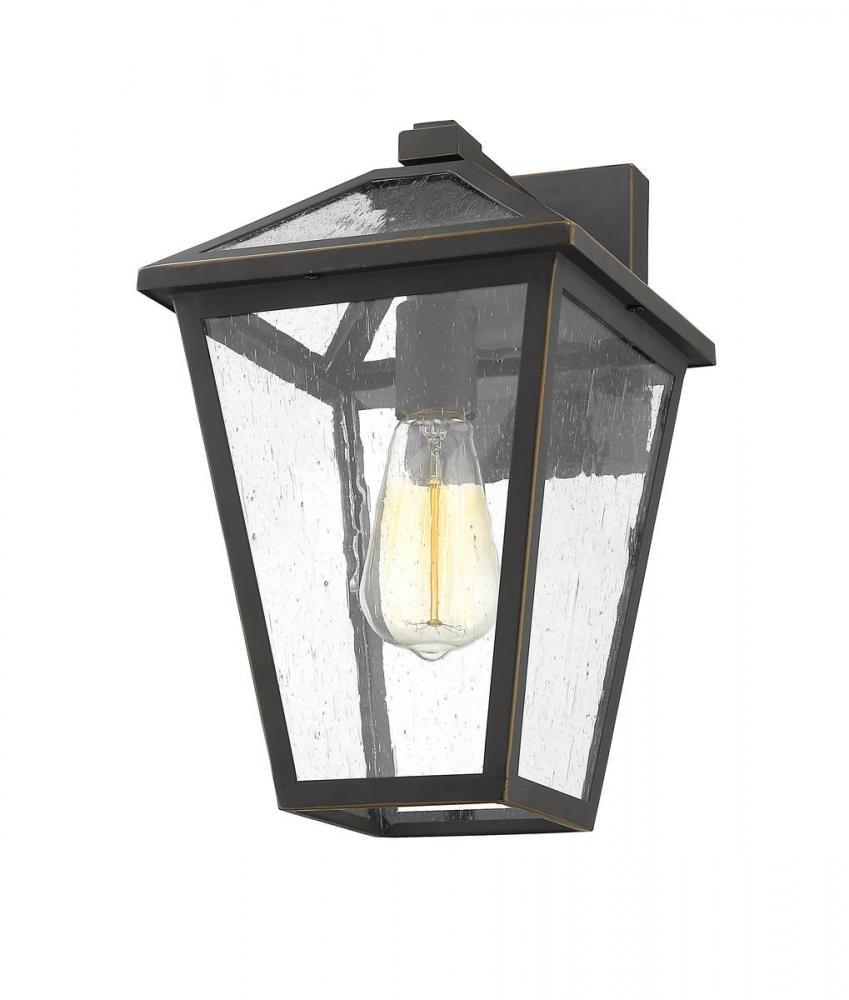 Illuminate an exterior front or back yard space with a classic fixture reflecting a charming village theme. Made from Rubbed Bronze metal and seedy glass panels, this single-light outdoor wall sconce delivers a charming upgrade with soft lighting on a residential structure.