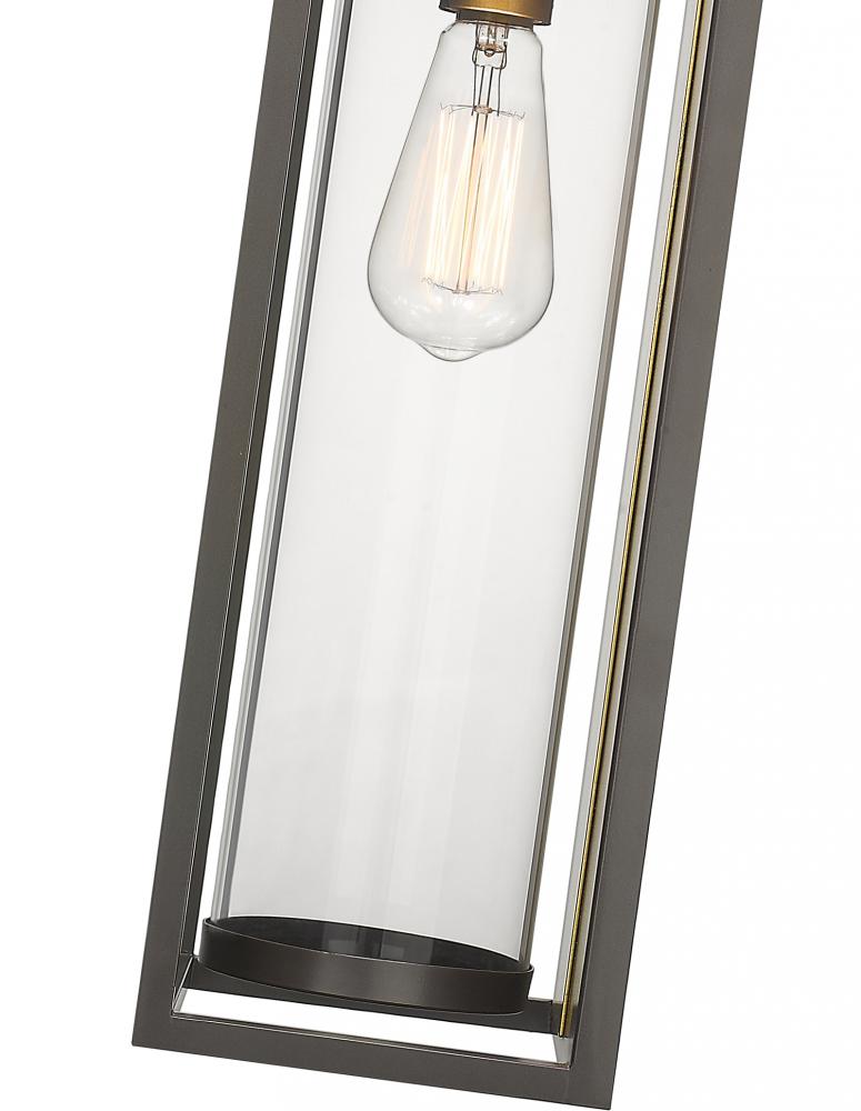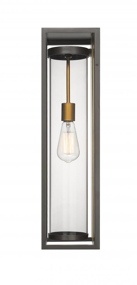 Minimal and understated, this modern outdoor wall sconce from the Dunbroch collection makes a wonderful addition to a patio or deck entertainment area. Its tall box-like aluminum frame features three open sides in a deep bronze and contrasting, warm golden brass finishes. Perfect for mounting in an outdoor veranda, a single drop down light sits inside a clear cylindrical globe, which casts a lovely glow.