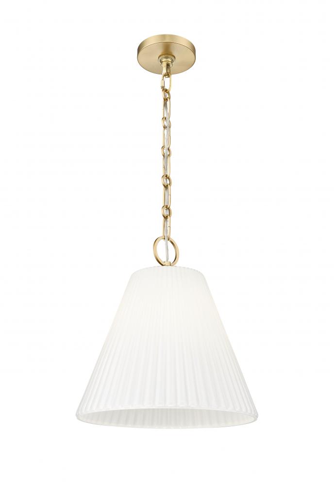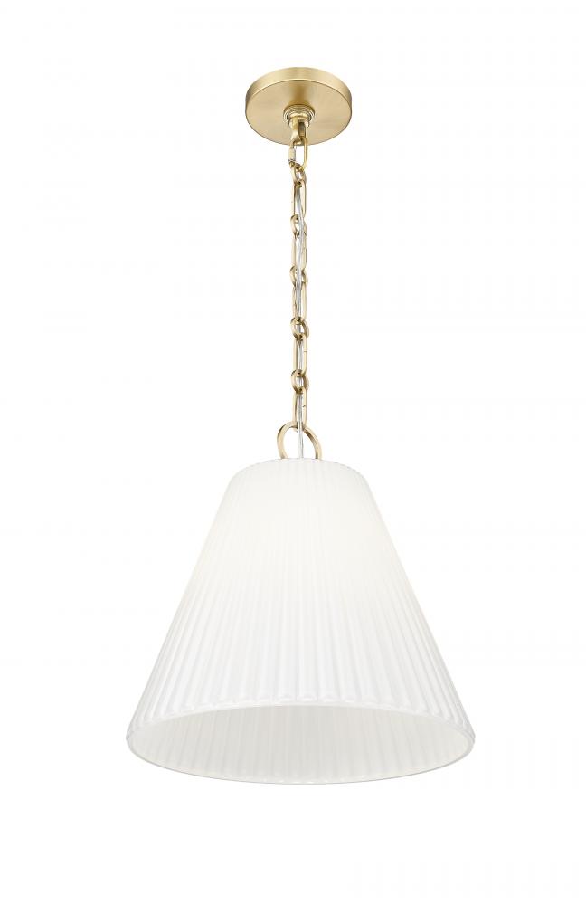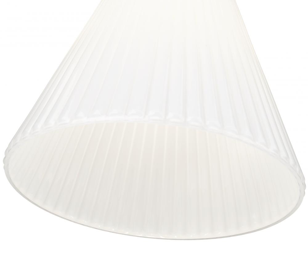 Fine fluting adds dimension and movement to the conical silhouette of a modern one-light pendant. Beautifully appointed, it boasts a modern gold accent finish its suspension and hardware, complete with elegant details that bring a sophisticated presence to white glass.