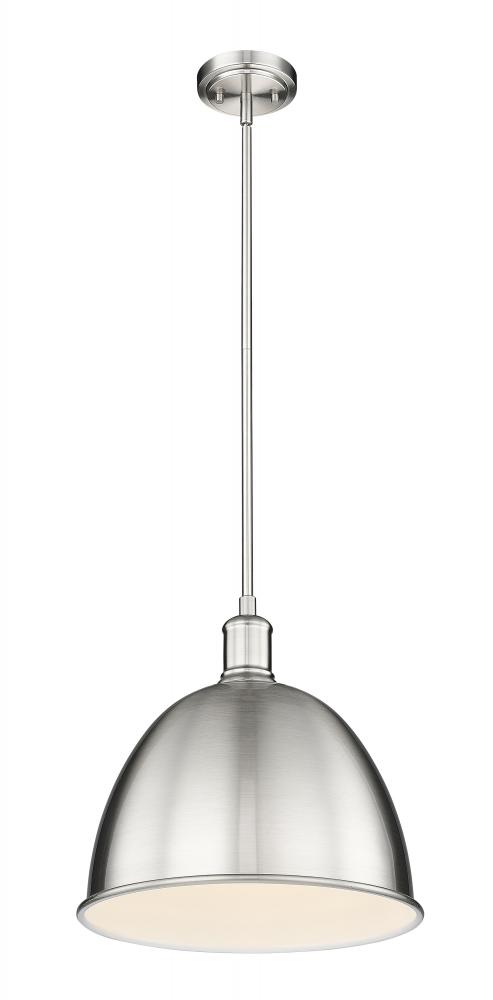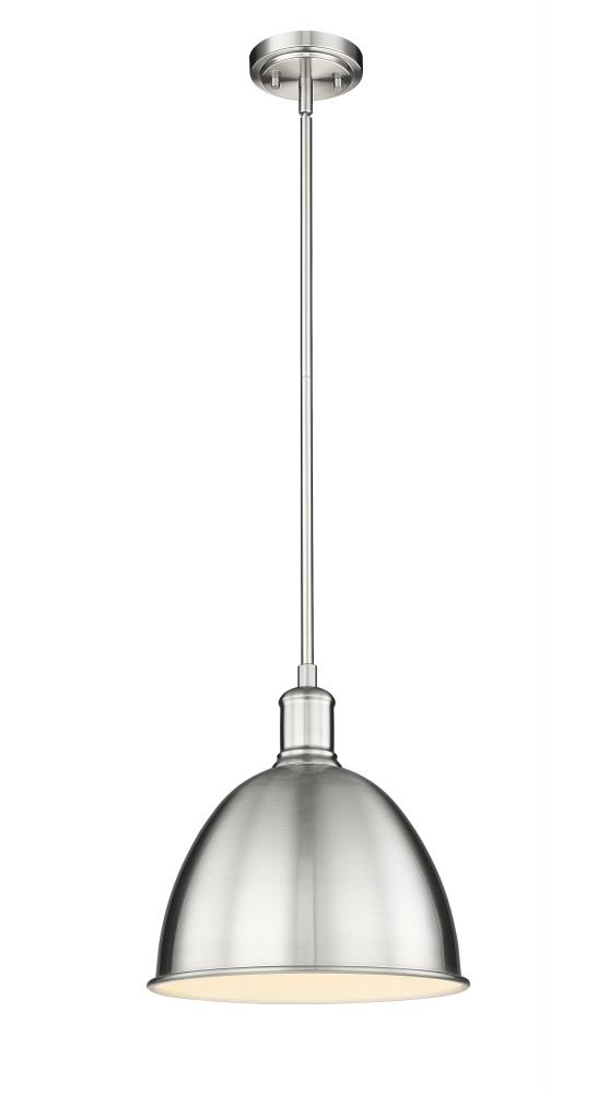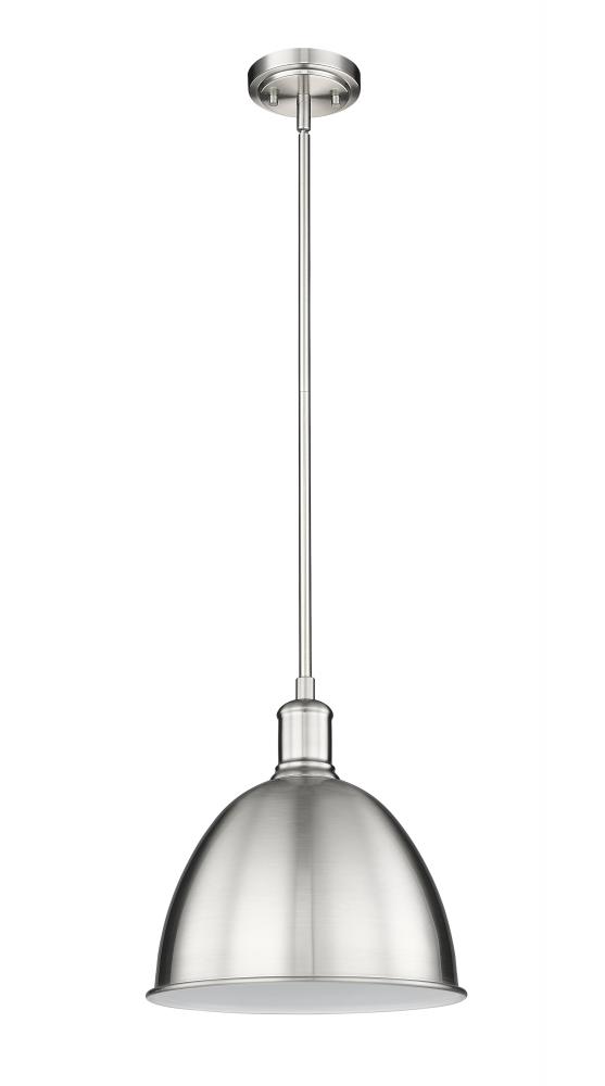 Give a gourmet kitchen a casual luxe look with this transitional modern farmhouse pendant. Designed with a shiny brushed nickel finish across a bell-like iron shade, this single light pendant lends a restoration style flair, reminiscent of schoolhouse or industrial lighting fixtures. Suspend this sleek urban-inspired pendant over an island, providing ample light for prepping and baking or simply creating a more inviting communal area for the family to gather.