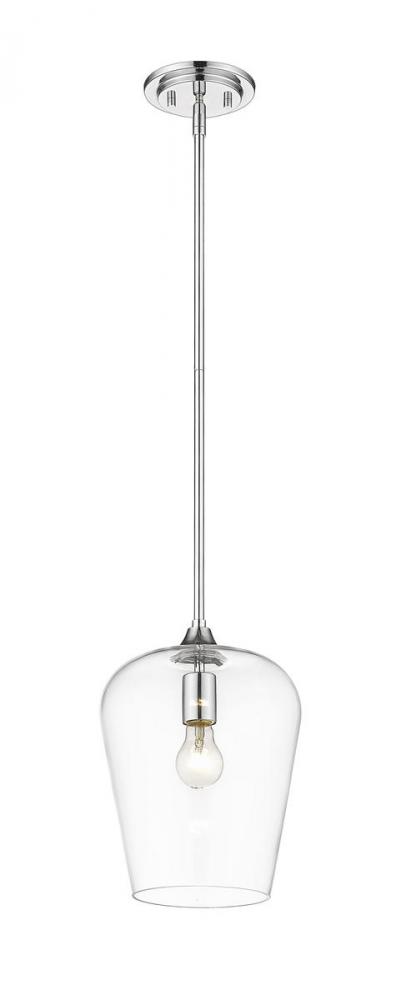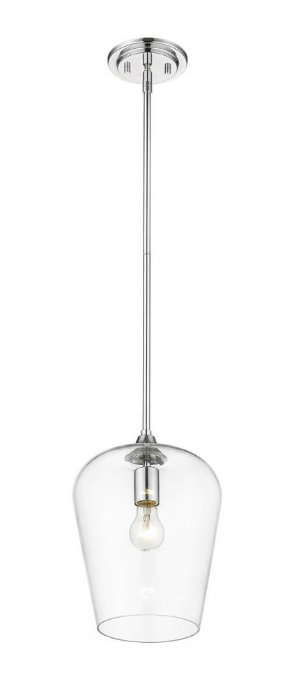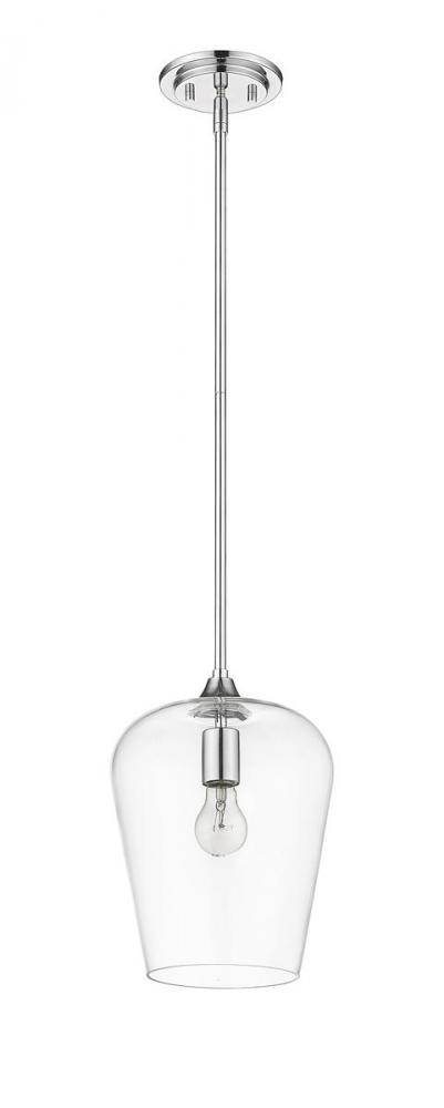 From the Joliet Collection comes an intriguing, ultra-modern one-light pendant offering a superb accent for kitchens, hallways, and main living areas. This pendant delivers a reverse-goblet design with a chic clear glass shade and gorgeous chrome finish steel holder, down rod, and canopy. Infuse custom contemporary charm with a delicate flavor.