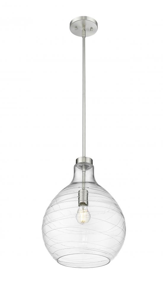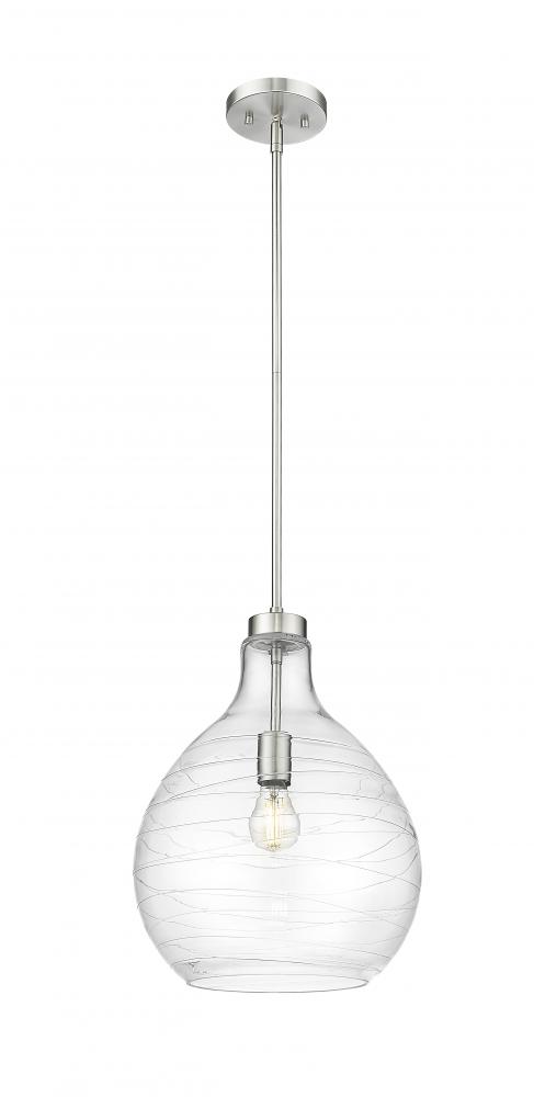 Curvy clear glass is accentuated with an artisan ribbon effect on a modern one-light pendant that makes a statement in your kitchen or living room. Charming in brushed nickel, it boasts a crisp, clean silhouette that brims with character as the dimensional shade refracts light to reduce glare and create an inviting ambiance in your home.
