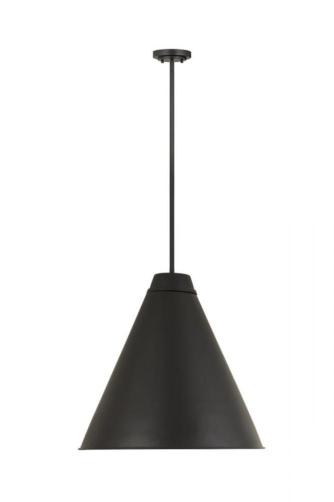 This statement-making one-light pendant makes lighting a staple in interior d?cor, delivering a trending industrial-inspired motif with casual appeal. A simple silhouette blends a conical shade, down rod, and canopy mount, all made of matte black finish iron. Dress up a casual kitchen island with a line of these sleek pendants from the Eaton collection, or place one in a targeted space for a special effect.