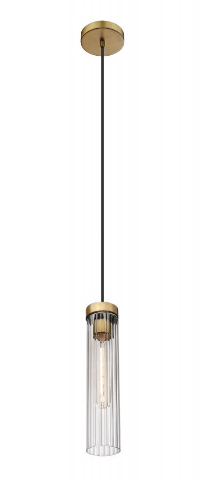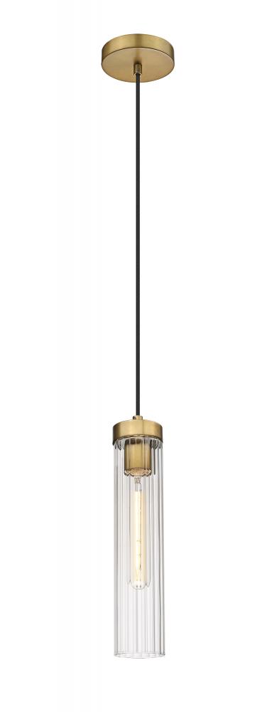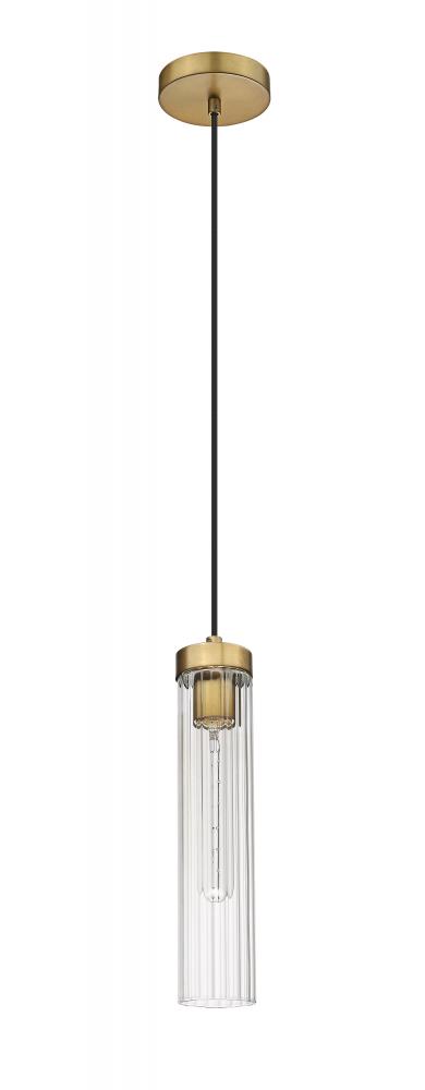 Slim, fluted glass create soft light diffusion for a Beau collection one-light pendant. Modern with a timeless sensibility, the pendant shows off a clean, precise silhouette complete with a black cloth suspension and rubbed brass hardware and ceiling plate for a warm finishing touch.