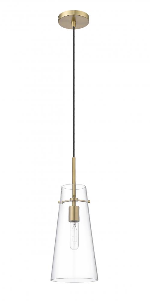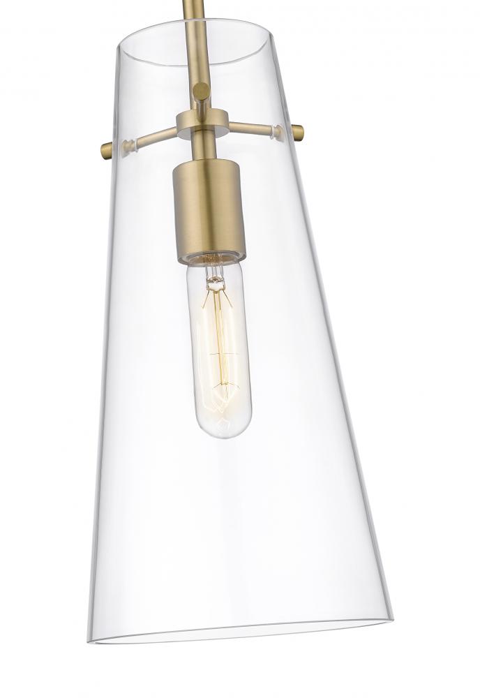 An elongated cone of clear glass sets the tone for a modern one-light pendant. Infused with minimalist elegance, it showcases a simple, sleek housing and suspension for a crisp, clean look and feel in your kitchen, living room or powder room. A warm modern gold finish is crisp and timeless, setting the tone for surrounding decor.
