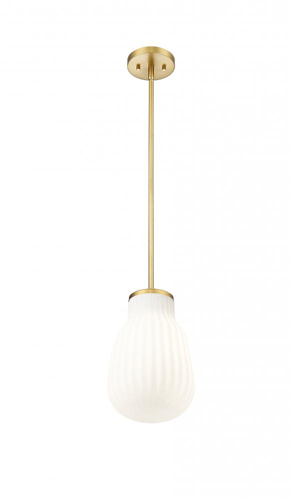 Make a statement in your bedroom or kitchen with the fresh, refined style of a modern one-light pendant. Updated schoolhouse style infuses the fixture, which boasts delicately ribbed glass in opaque white, lending soft illumination and inviting ambiance. A modern gold finish over its frame, down rod, and canopy adds the perfect dose of warm sophistication.