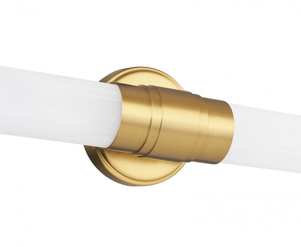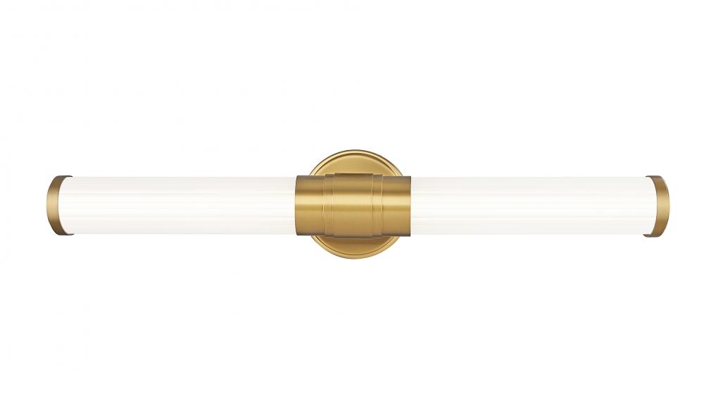 Highlight a refined space with the modern gold finish featured on this contemporary LED vanity bath light. Great for a primary or guest en suite, it offers a linear silhouette complete with a stepped collar and two cylindrical opal glass shades that are ribbed to create dimensionality. The fixture is complete with an energy efficient LED thats both dimmable and color selectable.