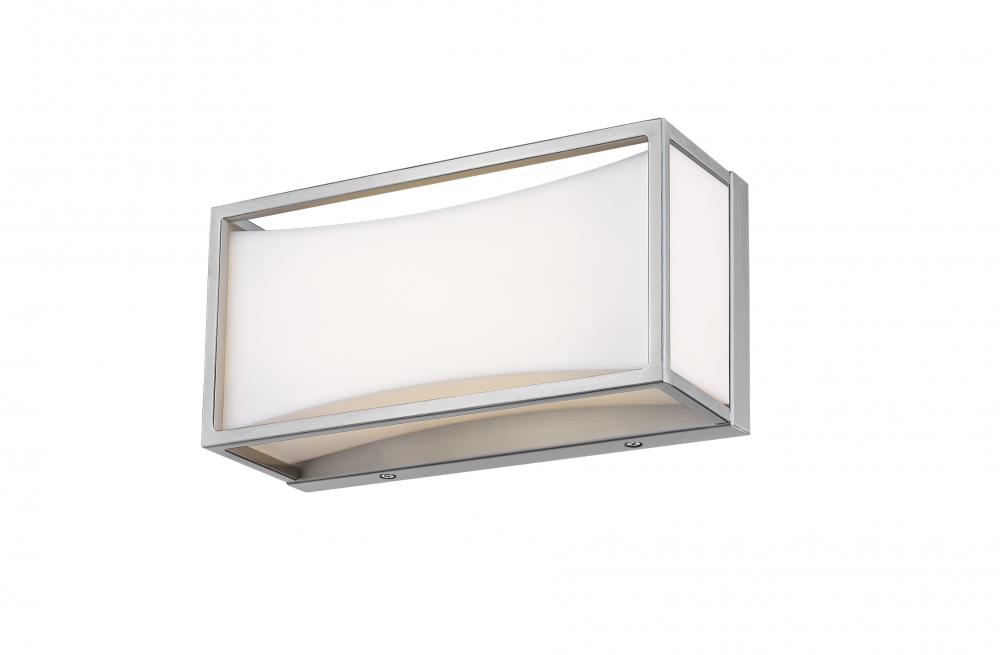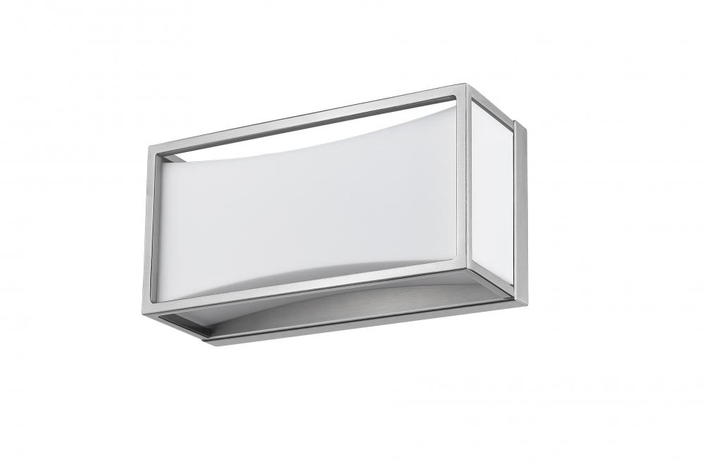 Sleek, gleaming lines of brushed nickel finish metal give this one-light vanity light a clean, modern look. Perfect for a powder room, it boasts a delicate, frosted white shade that diffuses the light into a soft, graceful glow.