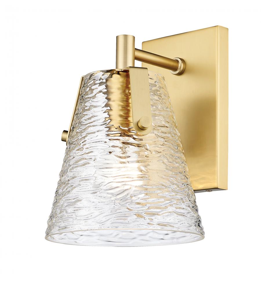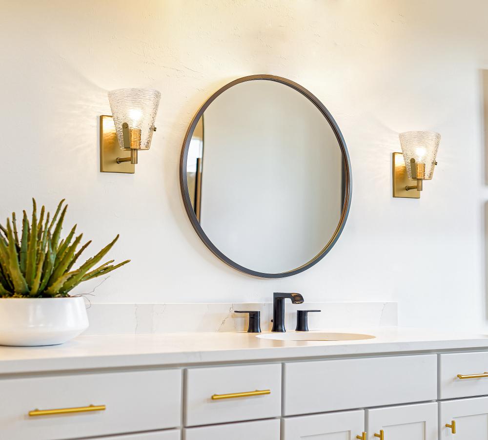 Evoking the look of sunlight dancing on waves, the textured surface on the Analia vanity series handblown glass shades underscores the spa-like feeling. Available in 1- to 5-light versions and a choice of Brushed Nickel, Chrome, Matte Black, or Modern Gold