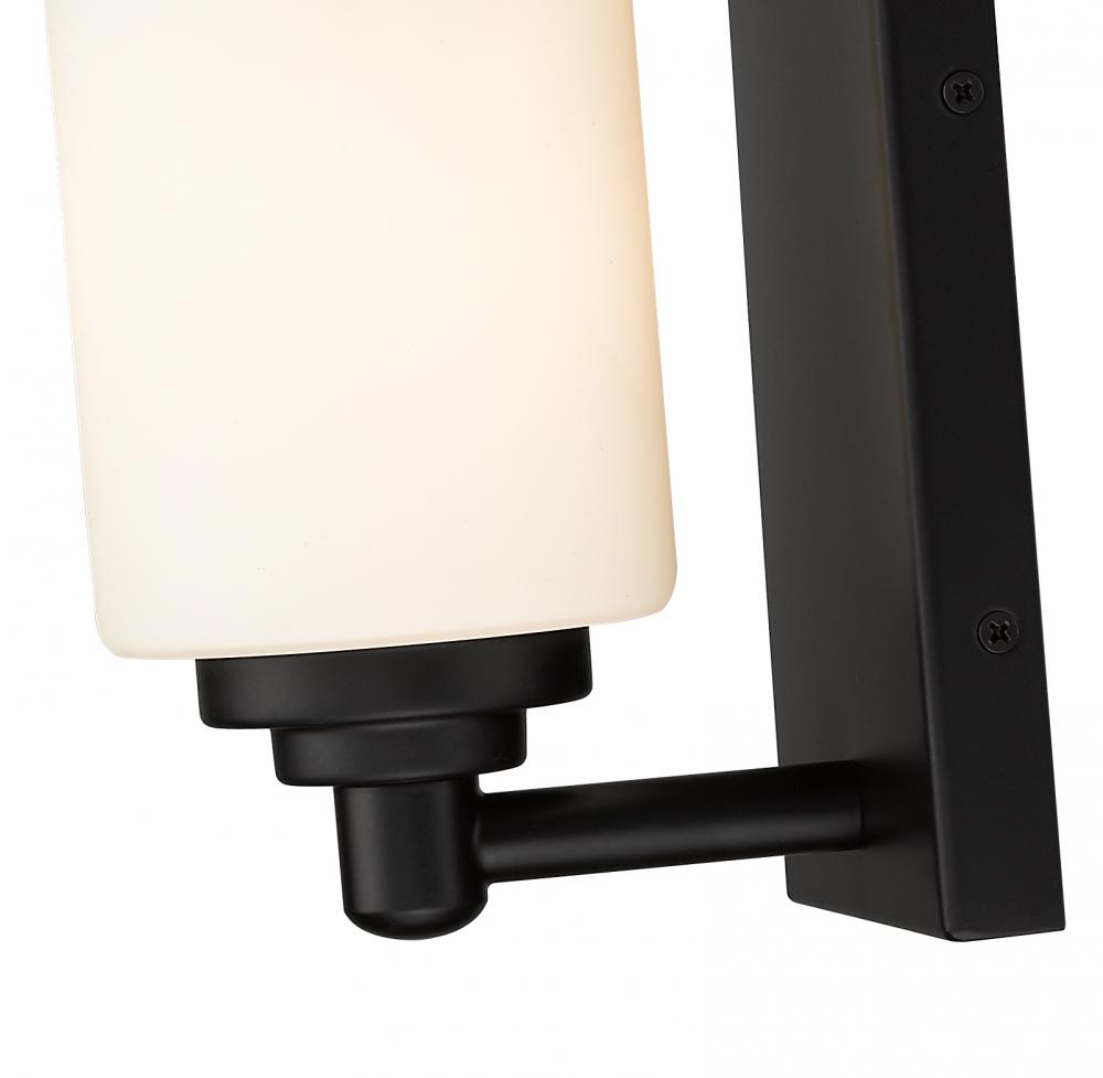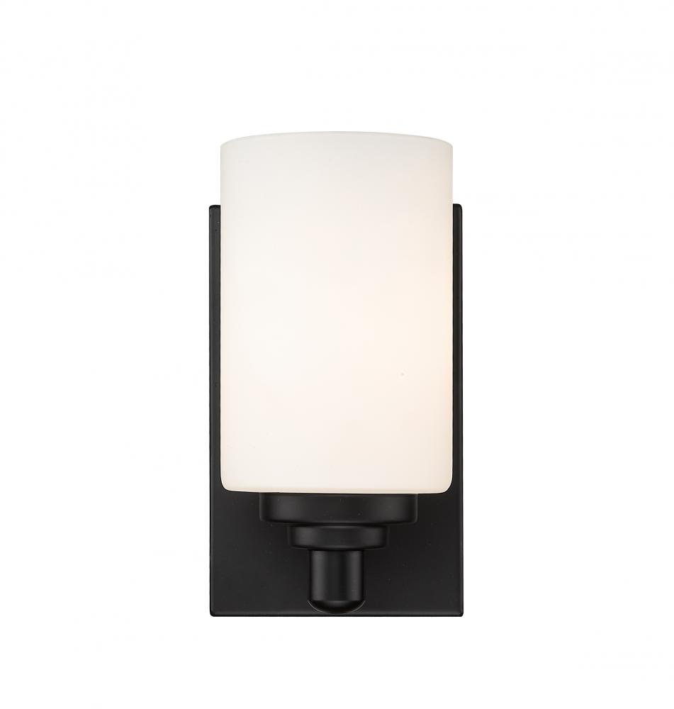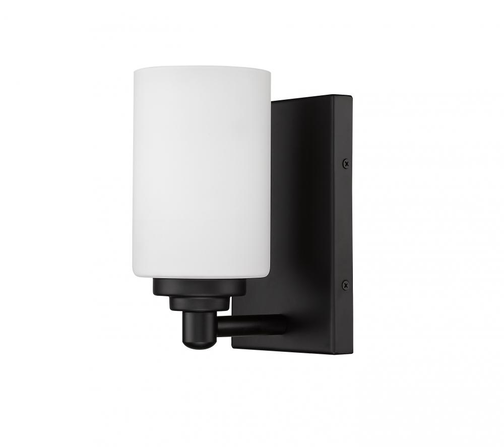 Let your bathroom, bedroom or hallway bask in soft, warm light. This contemporary one-light wall sconce has a sophisticated, streamlined look, and extends from a rectangular plate for a chic contrast. From the sconces cylindrical white etched glass shade to its matte black finish, this fixture stylishly upgrades your space.