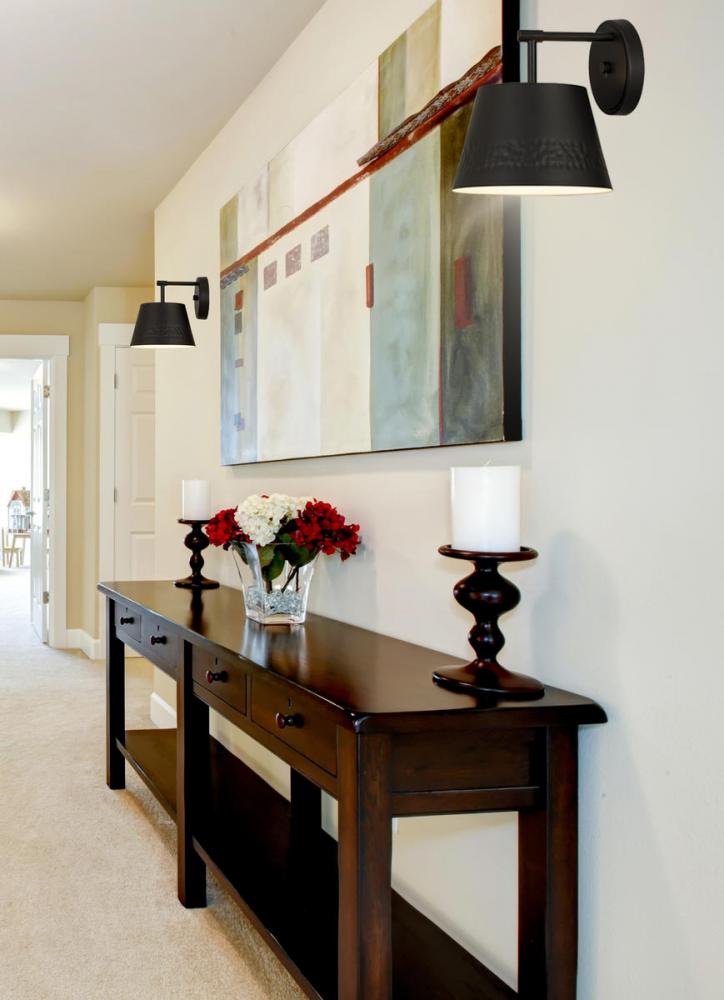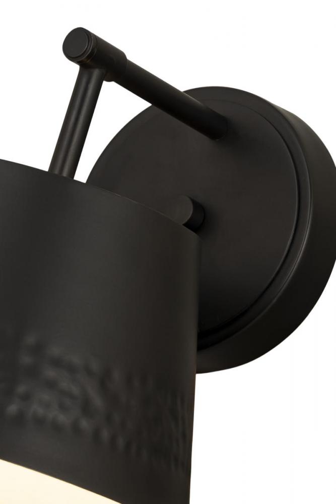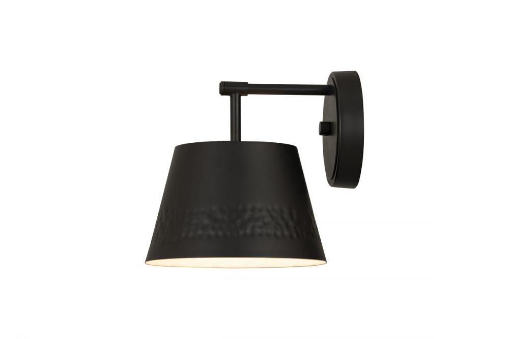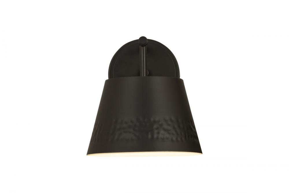 This one-light wall sconce from the Maddox collection creates a seamless, easy-living look for casual spaces in need of extra lighting. Matte black finish iron adds a decadent look to a sconce featuring a conical shade with a texturized hammered belt detail and matching wall mount. Dress up a bathroom or hallway space with this elegant light that incorporates farmhouse and industrial motifs.