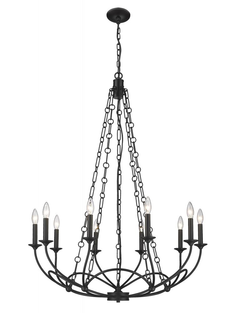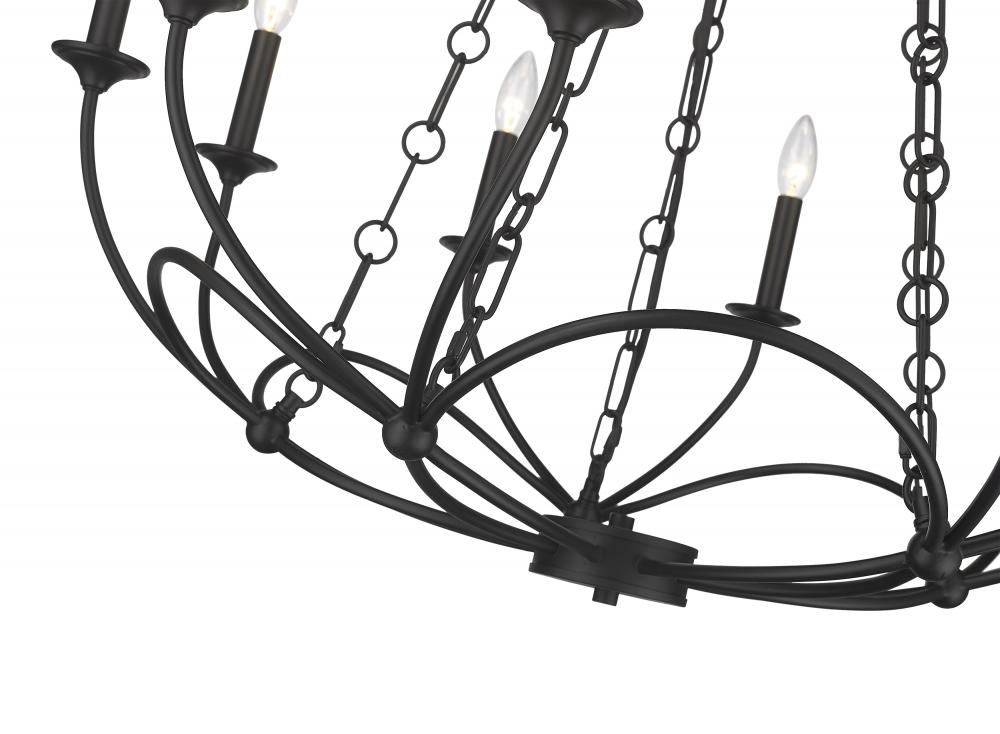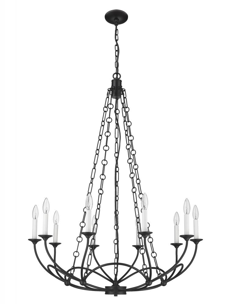 Make a design statement worthy of an enticing custom space, choosing this striking ten-light chandelier as a centerpiece in a dining room or foyer. From the Arabella Collection, this exquisite fixture maintains a light, symmetrical motif in spite of its bold matte black finish steel construction. A ribbon-like design accents its chicly arched frame with charming candelabra bulb mounts that soften edgy character.