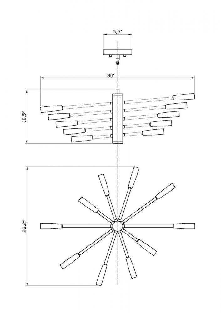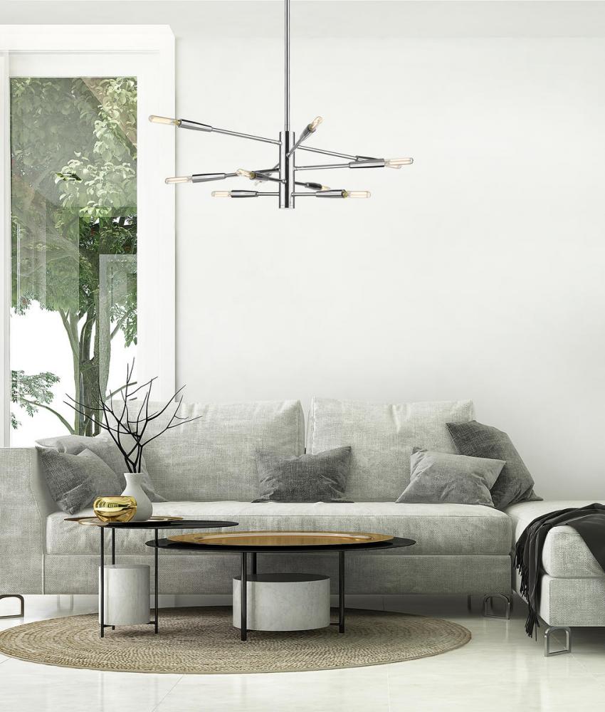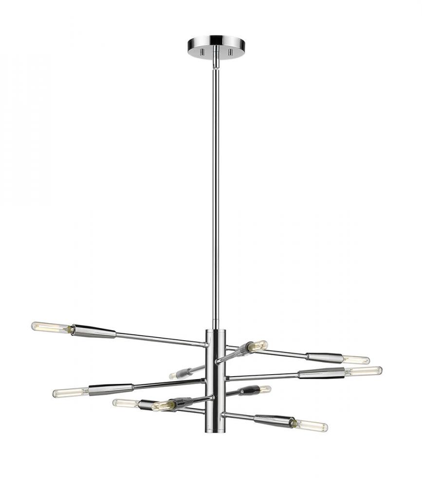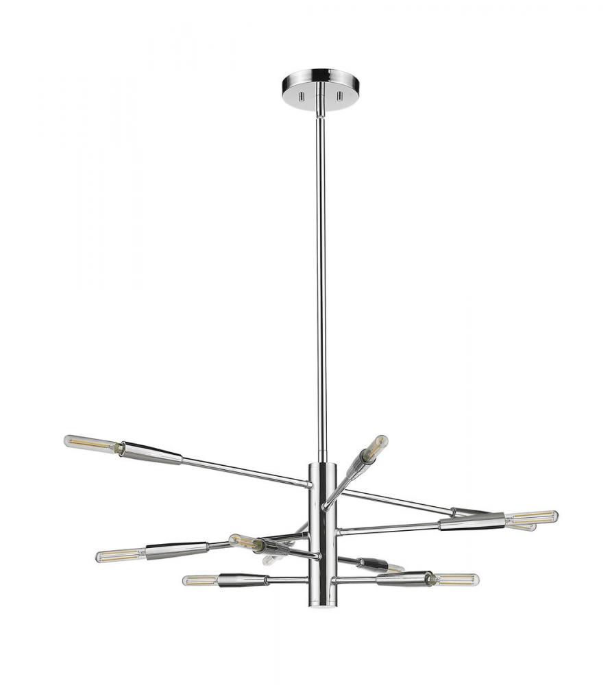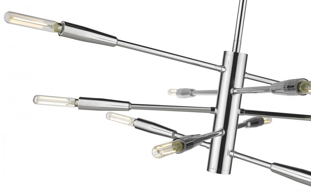 Bring the visual impact of a space-inspired fixture to any contemporary space, adding this dynamic ten-light chandelier to a modern dining room or living area. The sleek look of brilliant chrome finish steel shapes a linear frame and canopy with slender adjustable arms angled to create an abstract silhouette. This light from the Ascension collection captures attention when mounted on a straight or sloped ceiling.