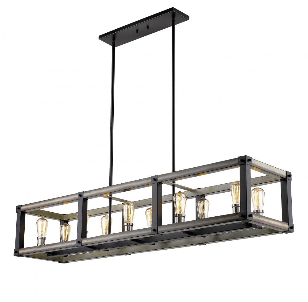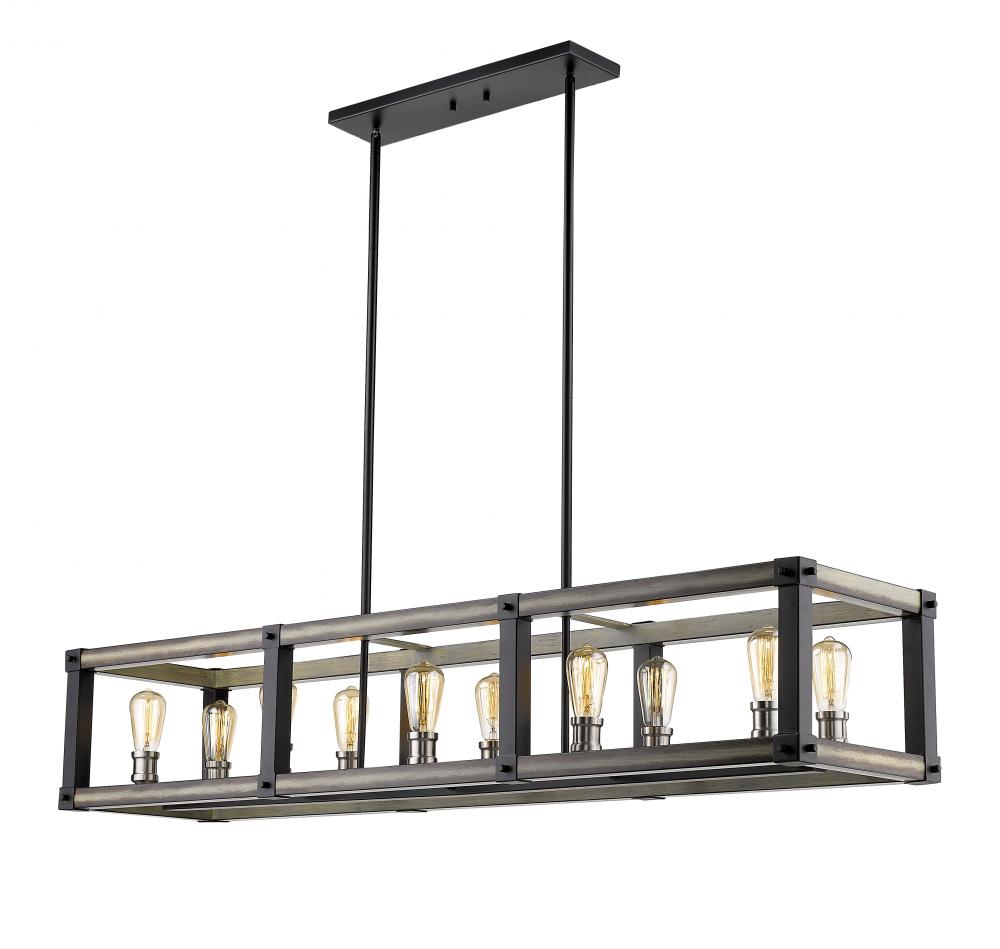 Sleek and elongated, this ten-light island pendant is perfect for an industrial motif. The open cage-inspired silhouette features a faux barnwood frame with ashen barnboard hardware accents.