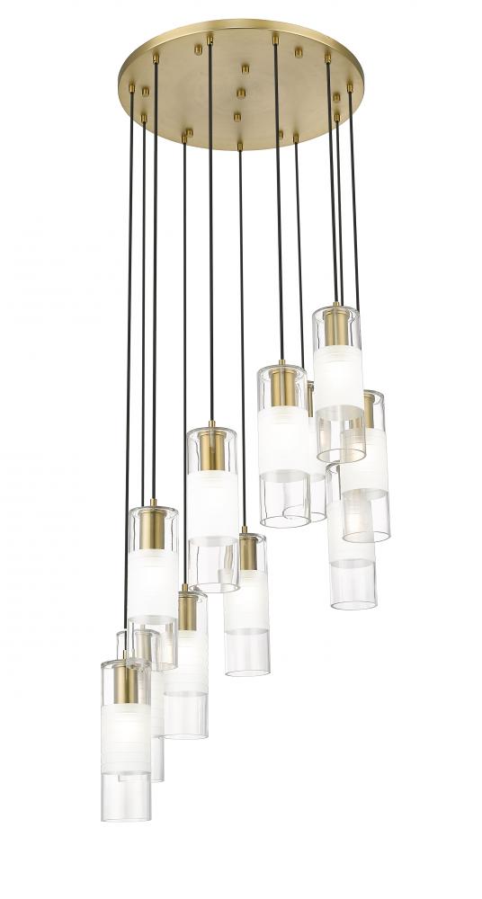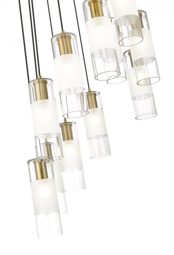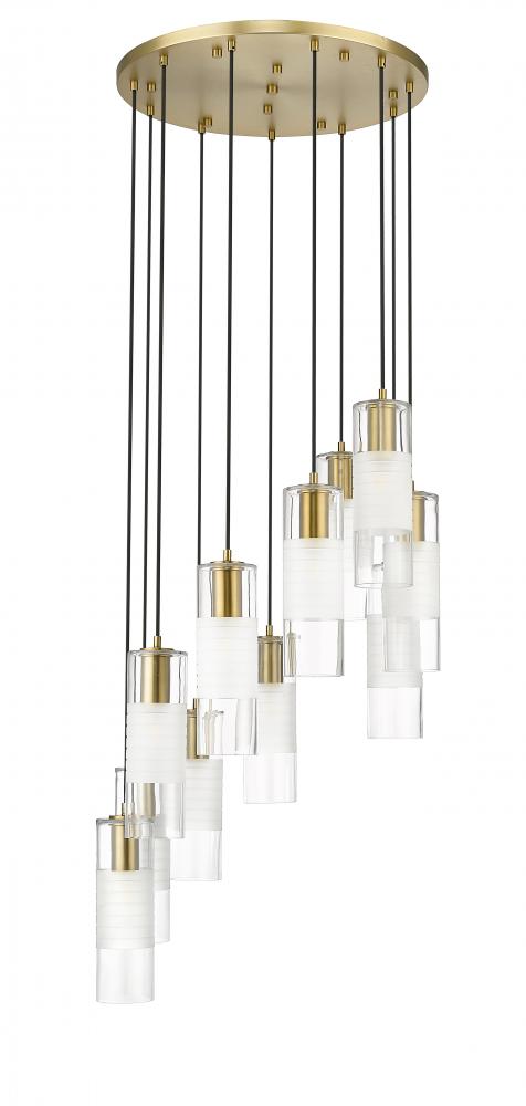 Chic artisan glass pairs with substantial steel housings to create a robust profile for a spiraling modern 11-light chandelier. Clear and frosted glass elements shade illumination to create lovely diffusion, offering exceptional ambiance over a dining table or foyer. Modern gold finish adds a warm, refined touch.