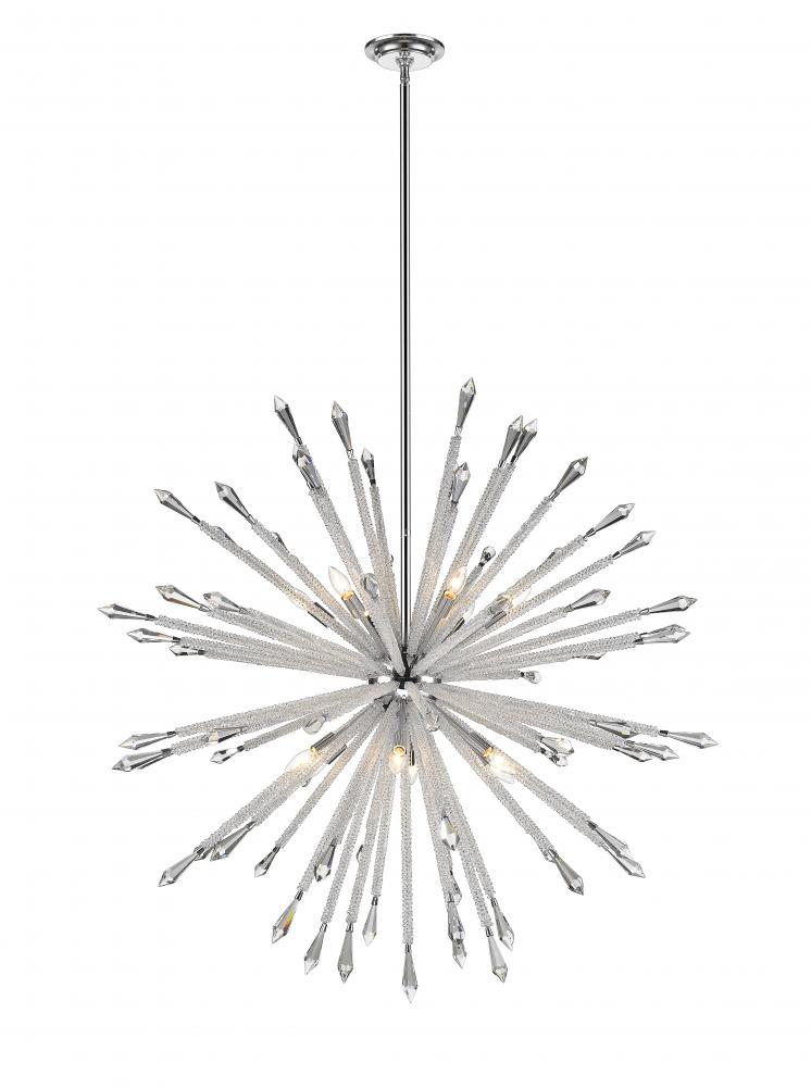 Fabulous energy and a crisp chrome finish team up to emulate a spherical fireworks display, making this twelve-light chandelier a must-have design element for a modern space. Delicate crystal stems with iron accents protrude from a center point, bringing an artful and captivating aesthetic as well as a perfect level of lighting.