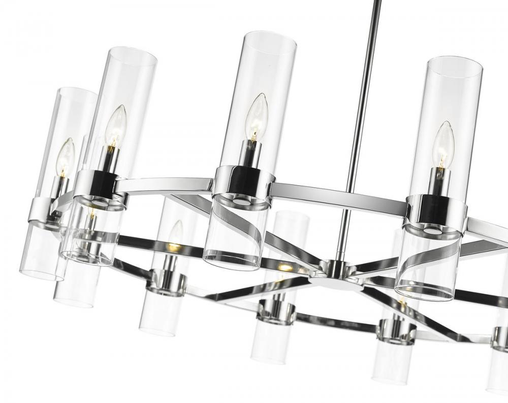 This contemporary twelve-light chandelier from the Datus collection features a slick round silhouette and a sense of simple elegance. Illuminate a foyer, dining area, or main living space with this circular-inspired chandelier featuring solid iron with a sleek polished nickel finish and delicate clear glass cylinders.